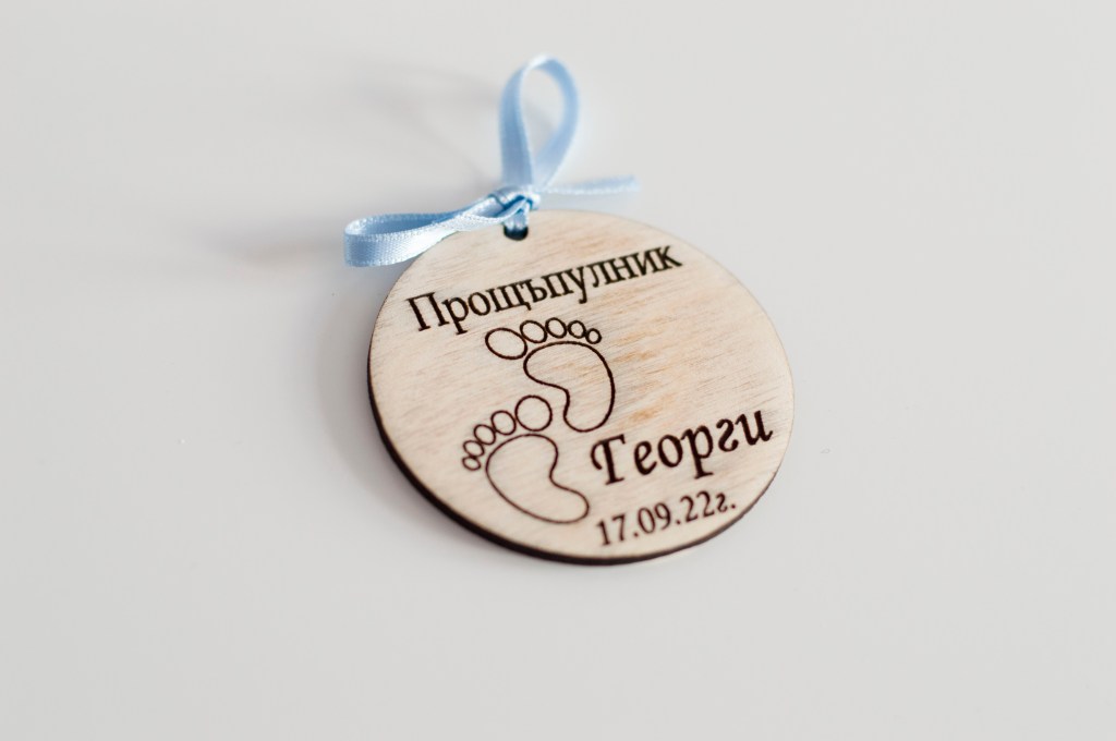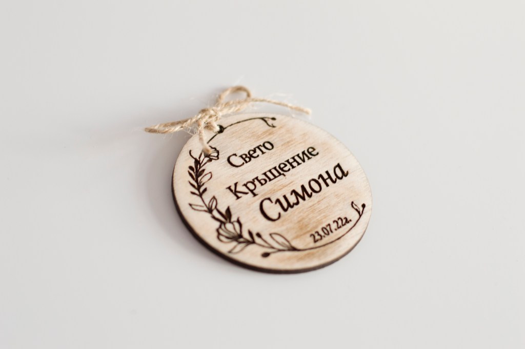 Симпатичен подарък за гостите на вашето тържество. Тагът може да бъде гравиран с текст по ваше желание, с шрифт по избор. Цвета на панделката е по избор.