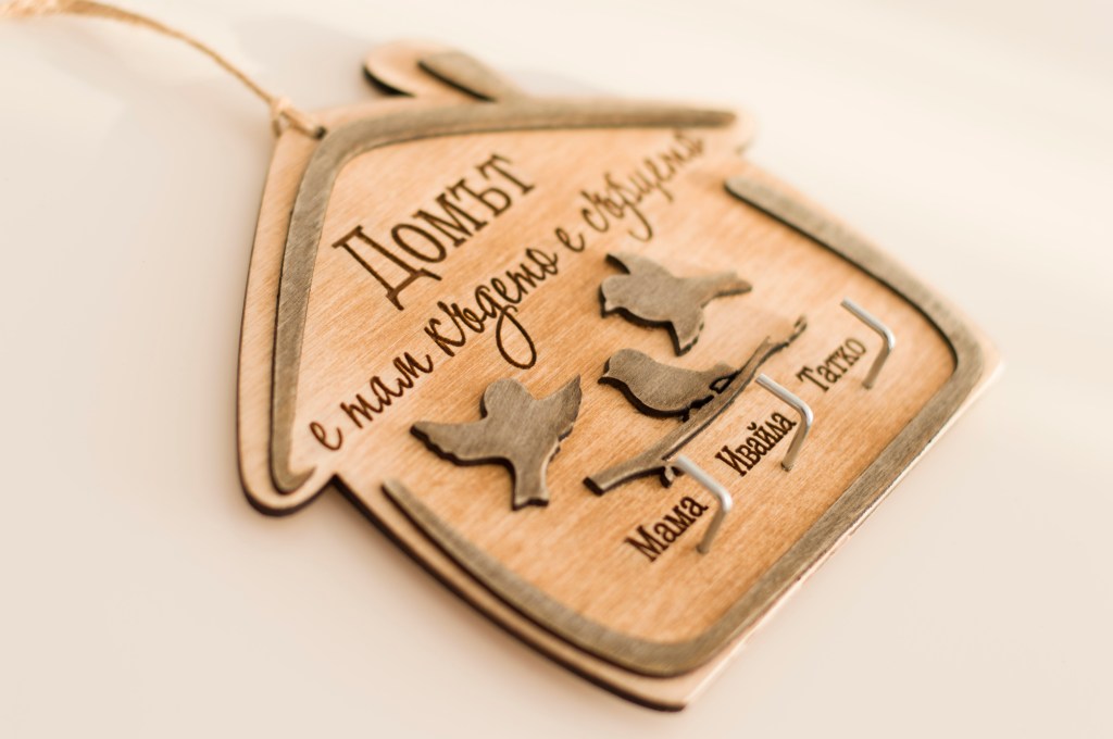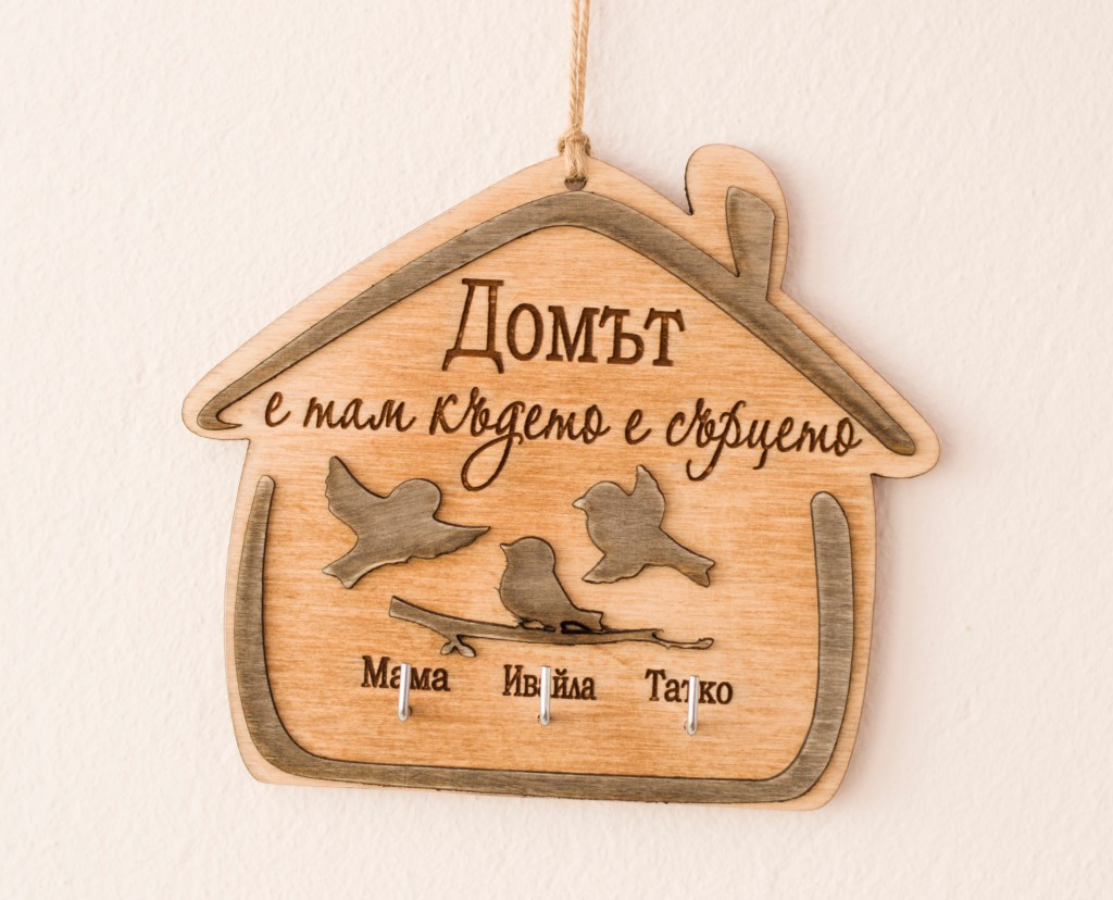 Лесно и удобно организиране на ключовете у дома. Къщичката може да бъде гравирана с вашите имена и текст по ваше желание, с шрифт по избор.