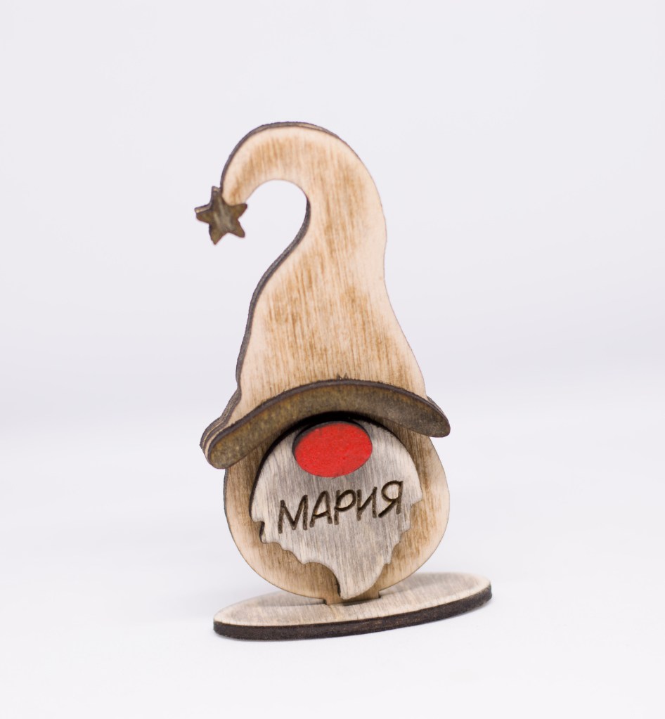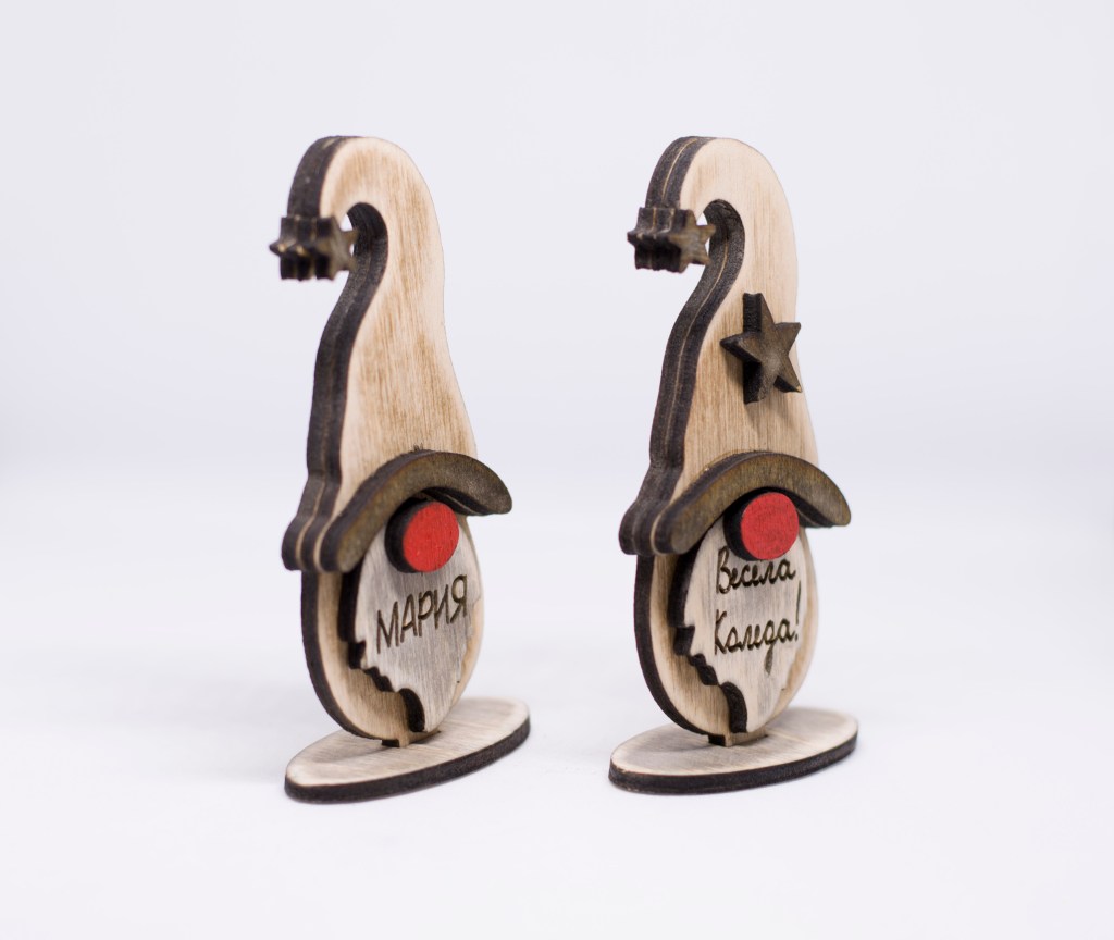 Beautiful addition for your Christmas decoration. It can be engraved with a text at your request, you can choose the font. Every toy can be with a different element on the hat or more than one – heart, star, flower or etc.