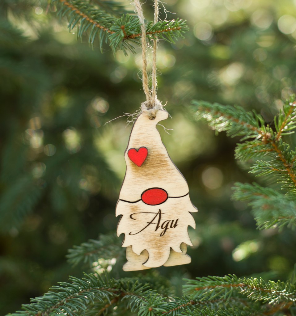 Красиво допълнение към коледната ви украса. Първата Коледна играчка на вашето дете. Играчката може да бъде гравирана с текст по ваше желание, с шрифт по избор. Цвета на панделката е по избор.Всяка играчка може да бъде с различен елемент на шапката – сърце, звезда, цвете и др.