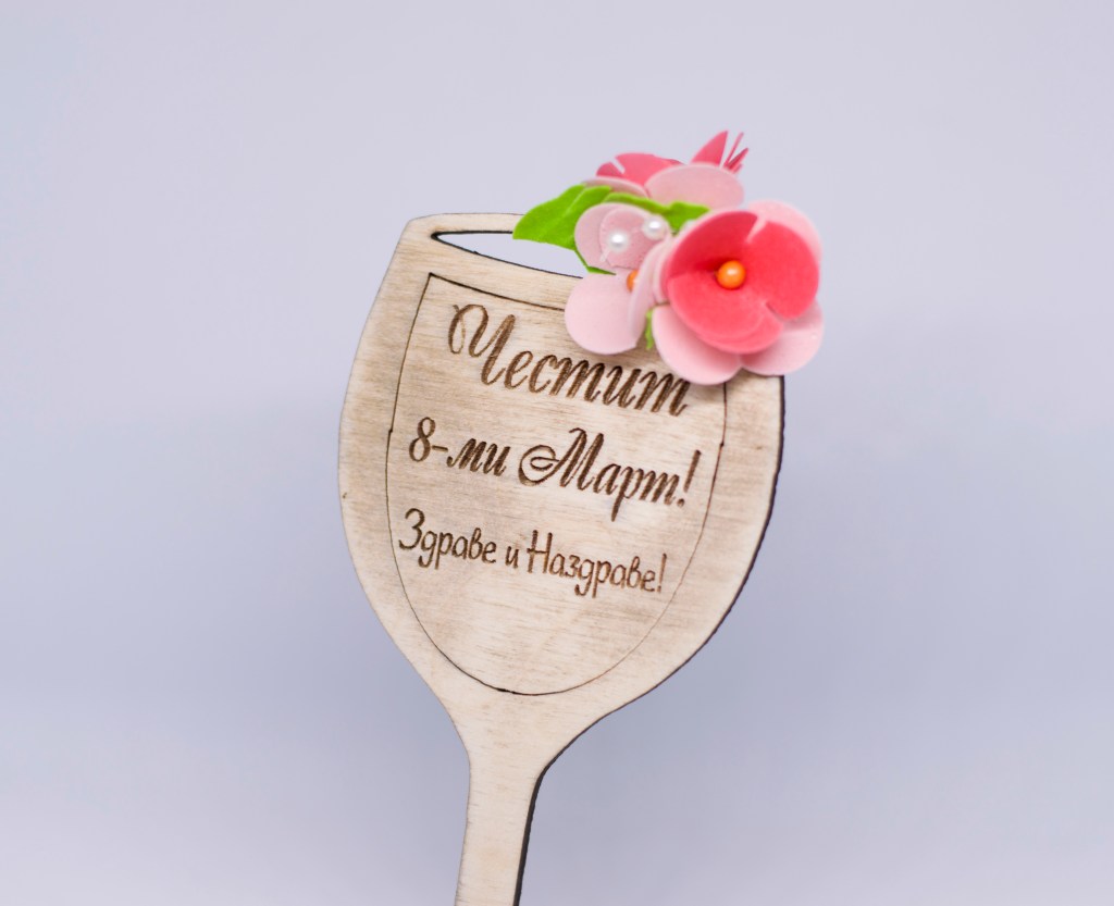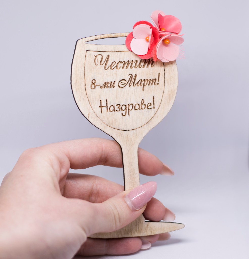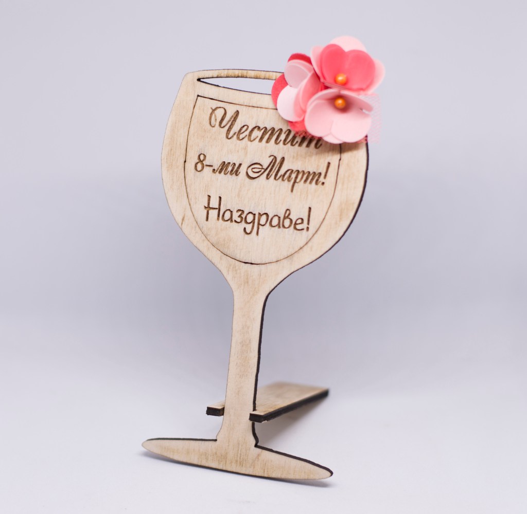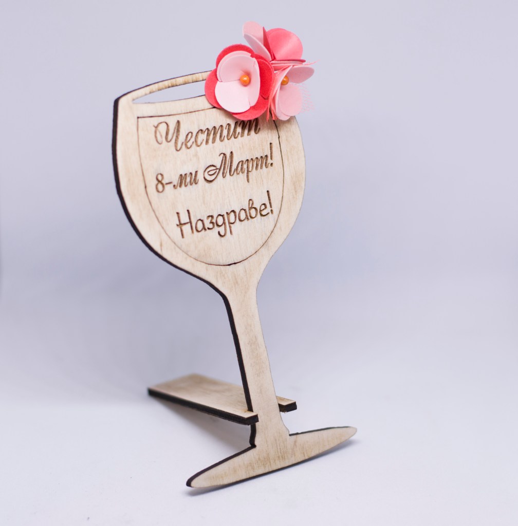 Табелка за 8-ми Март под формата на чаша за вино, лазерно гравирана.