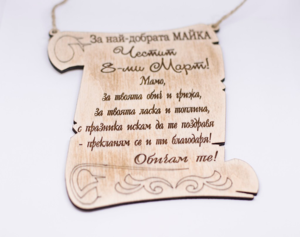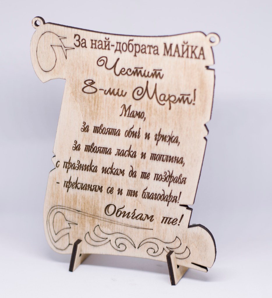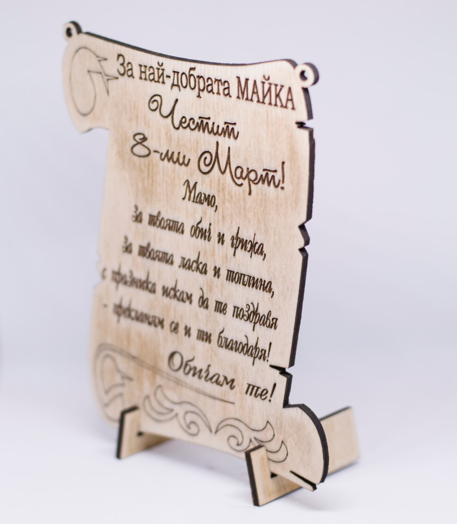 Симпатичен подарък подходящ за любимите хора. Табелката може да бъде гравирана с текст по ваше желание, с шрифт по избор. Предлага се в два варианта: на поставка или за окачване на стена.