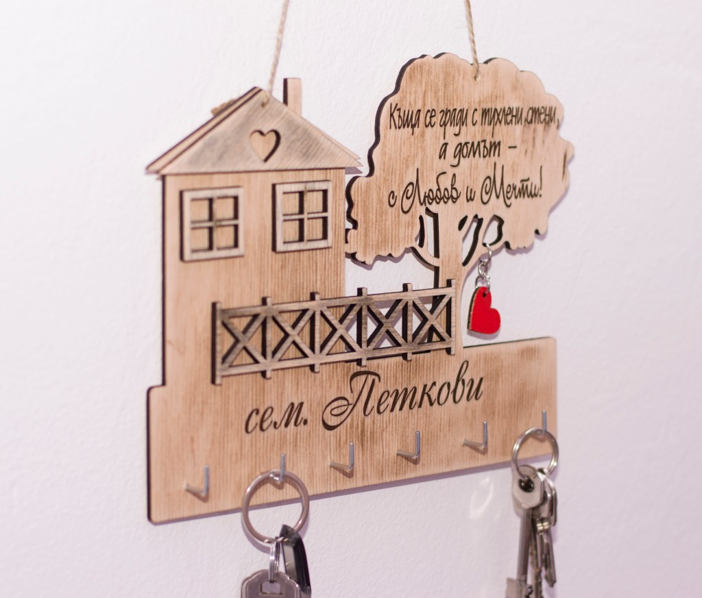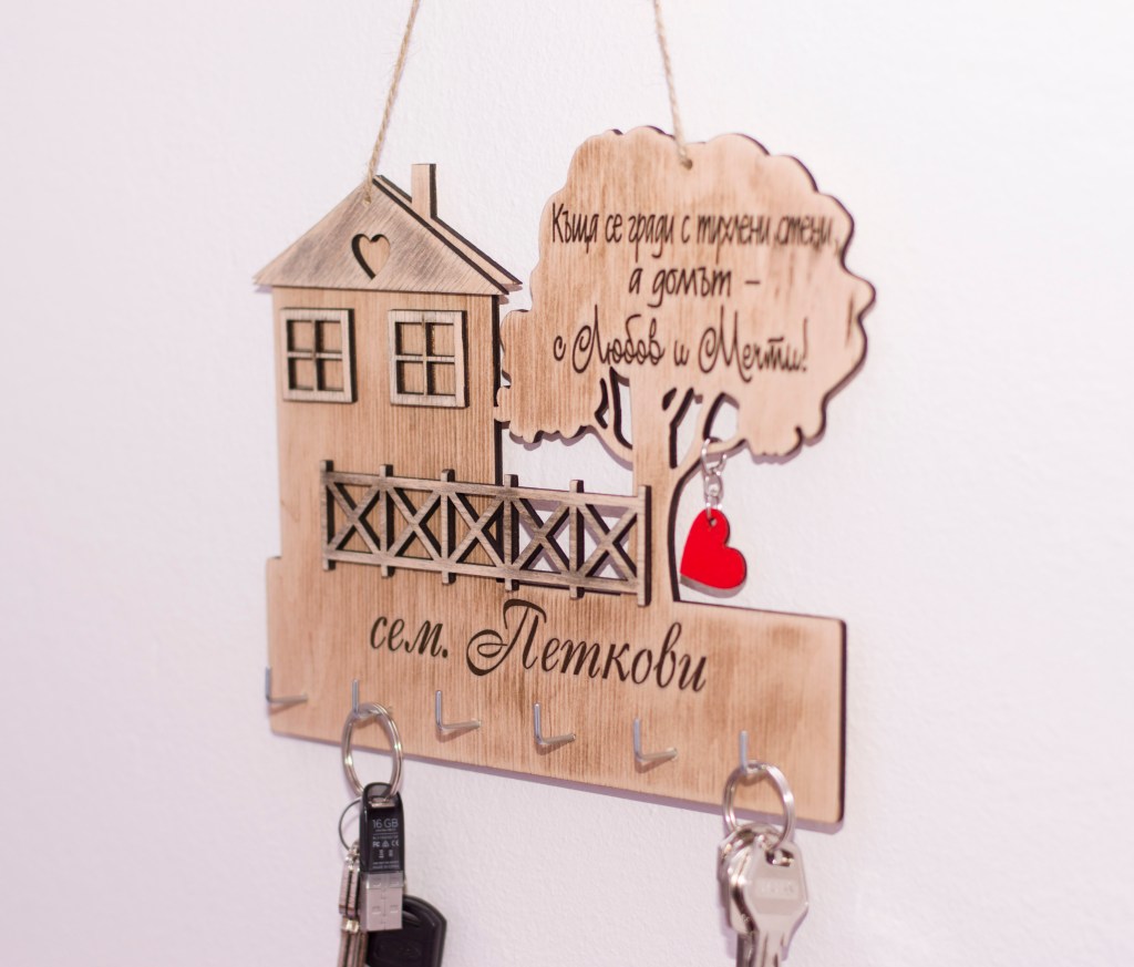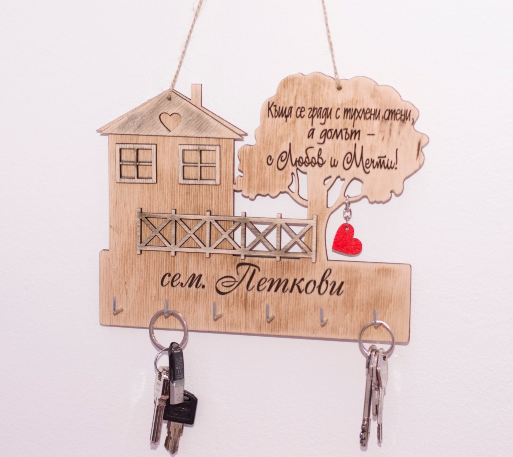 Лесно и удобно организиране на ключовете у дома. Поставката може да бъде гравирана с вашите имена и текст по ваше желание, с шрифт по избор.