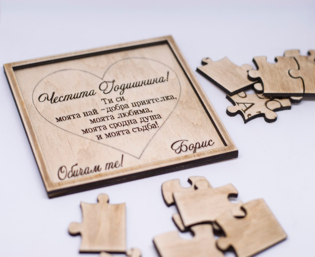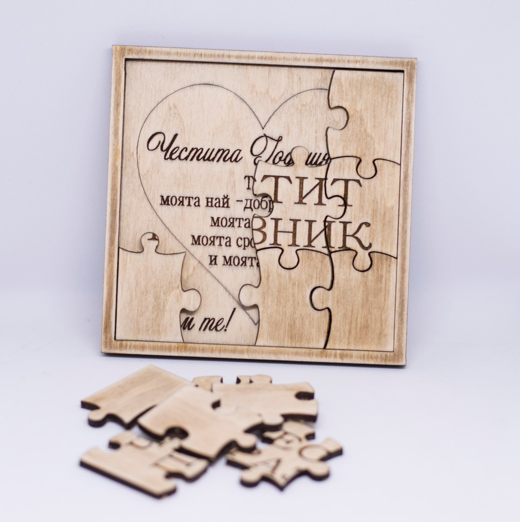 Оригинален подарък за любимия човек. Пъзелът може да бъде гравиран и отгоре (върху частите на пъзела) с текст по ваше желание, с шрифт по избор. Може да се персонализира с имена или текст по ваш избор.