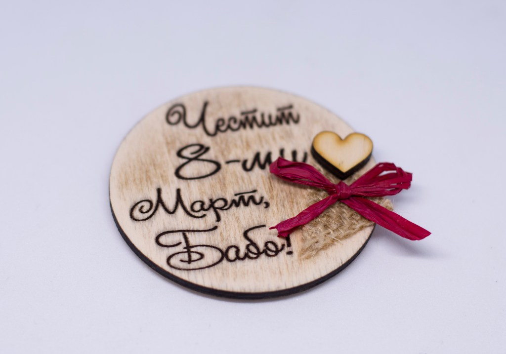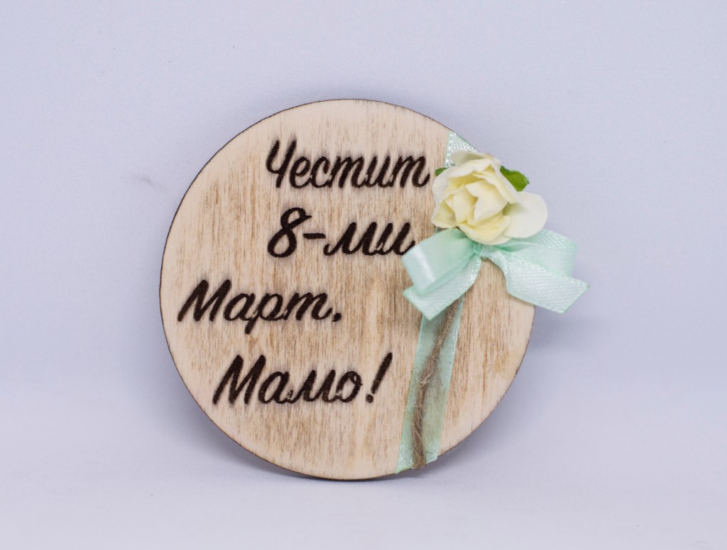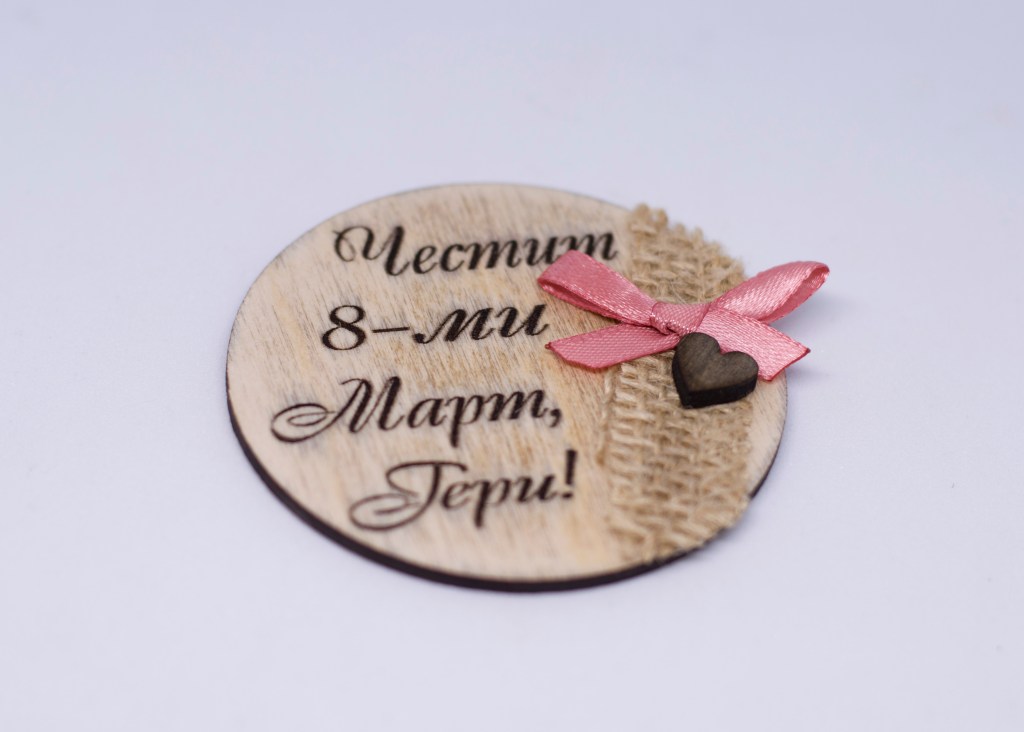Дървени магнитчета за 8-ми Март, лазерно гравирани.
