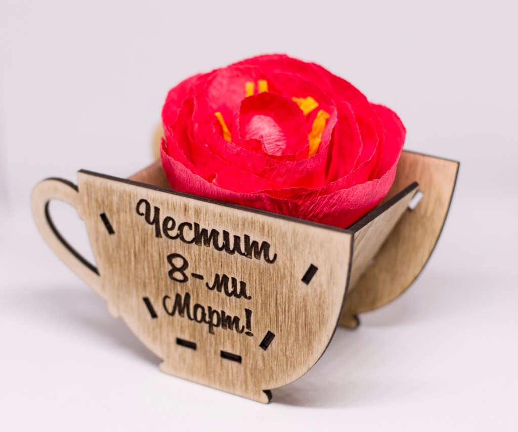 Симпатичен подарък подходящ за 8-ми Март и подобни поводи. Може да бъде гравирана с текст по ваше желание, с шрифт по избор. Предлага се с ръчно изработено цвете от хартия, а вие може да го декорирате по ваш вкус (с бонбони или дребни десертчета.