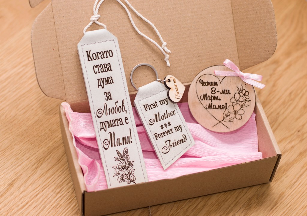 Персонализиран комплект от ключодържател, книгоразделител и магнит лазерно гравирани.