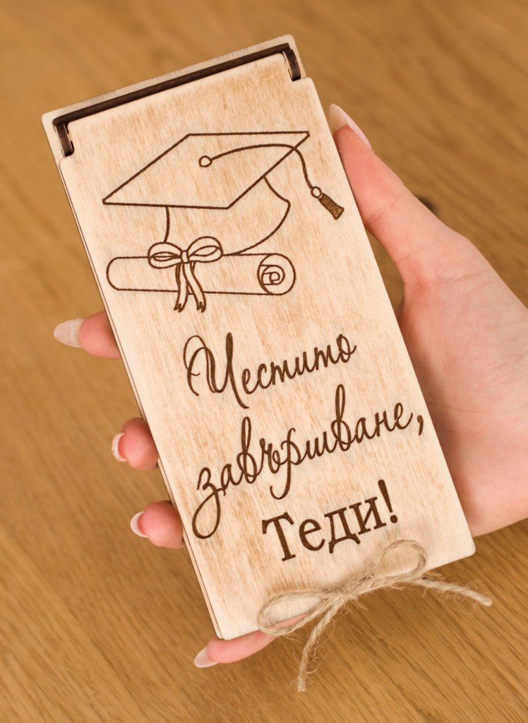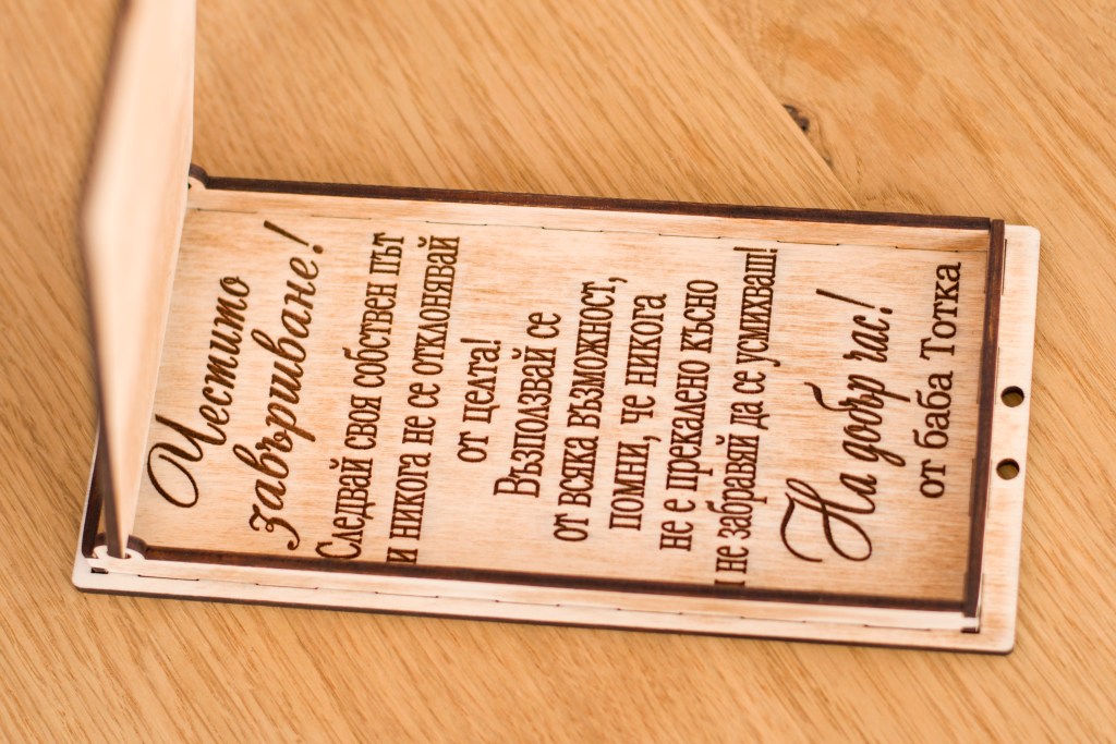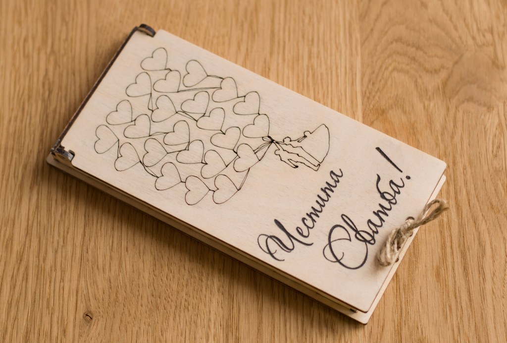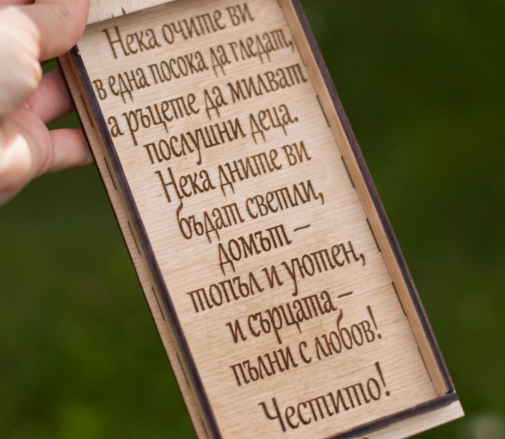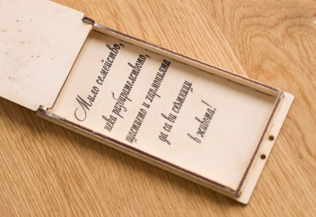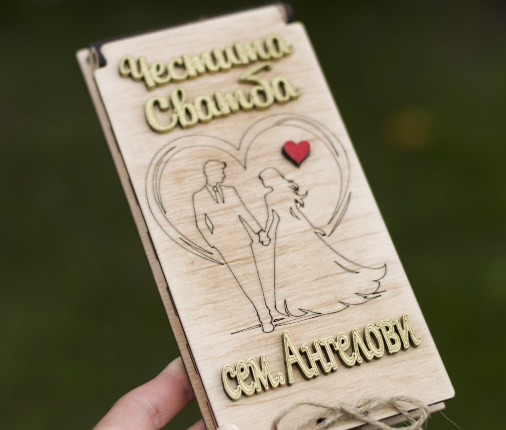 Персонализирана дървена кутийка (плик) за пари, лазерно гравирана.