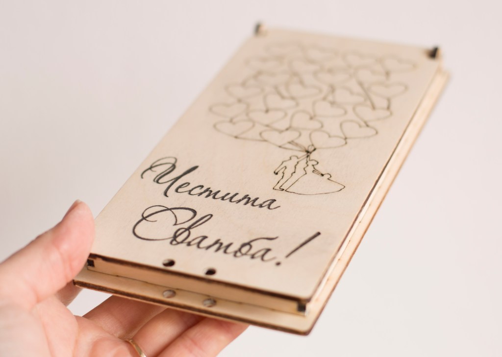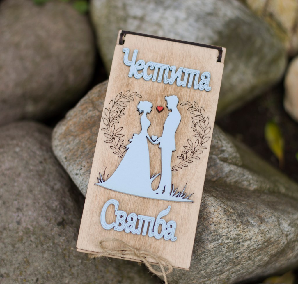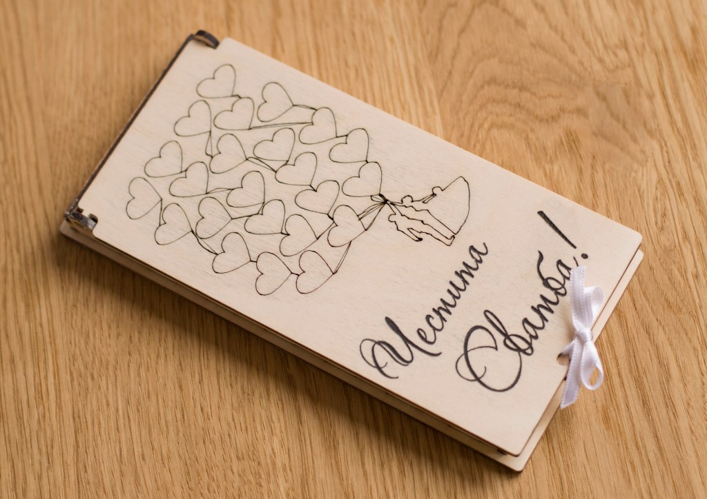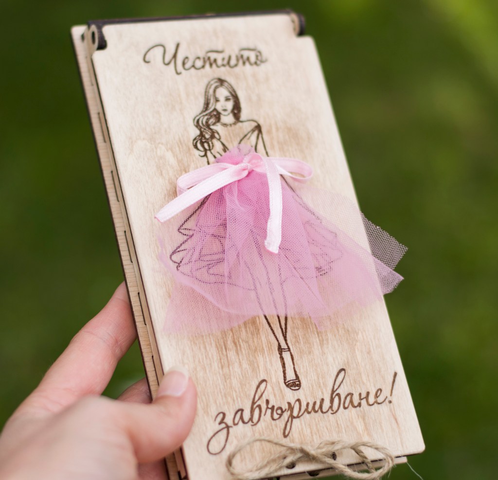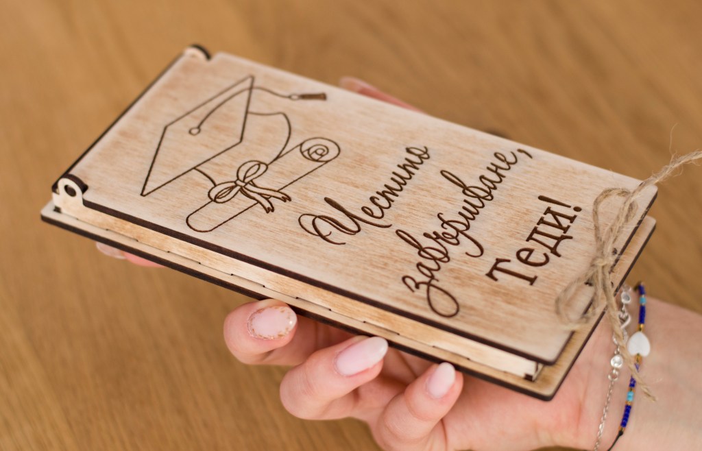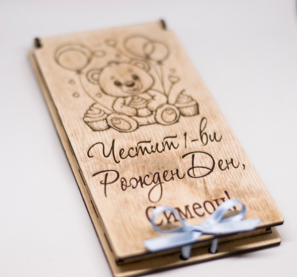 Персонализирана дървена кутийка (плик) за пари, лазерно гравирана.