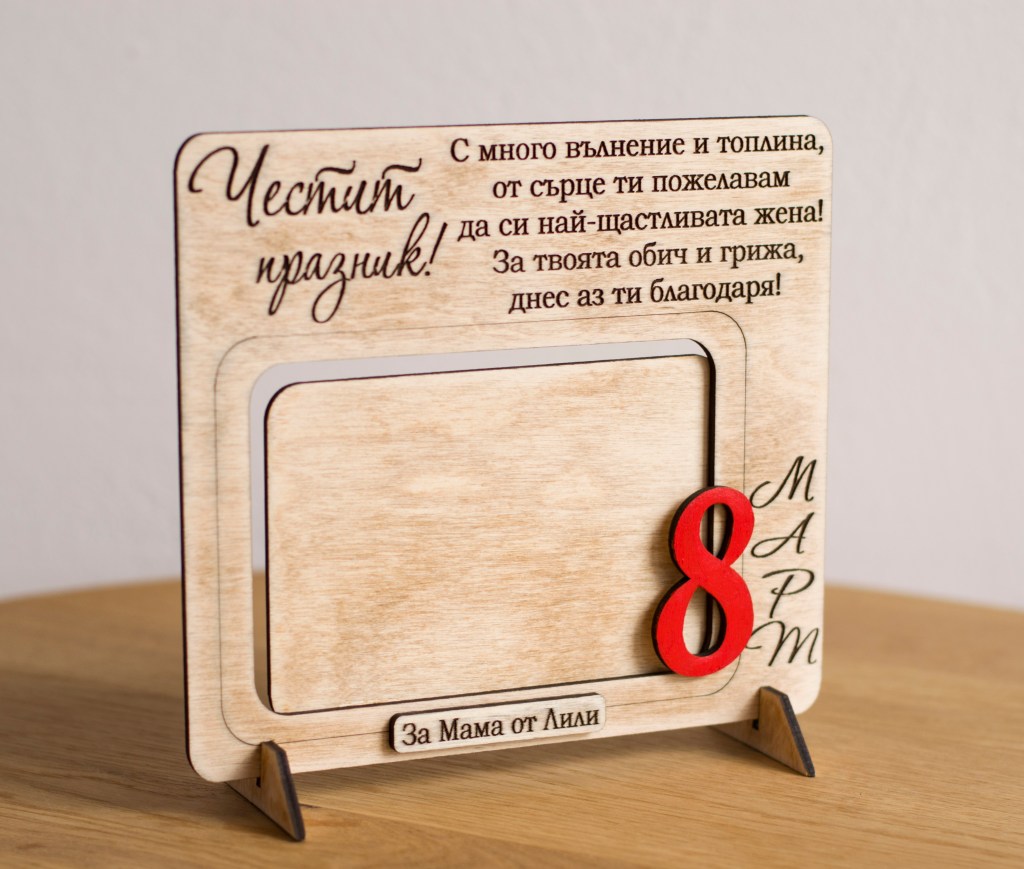 Дървена персонализирана рамка за снимка за 8 – ми Март , лазерно гравирана.