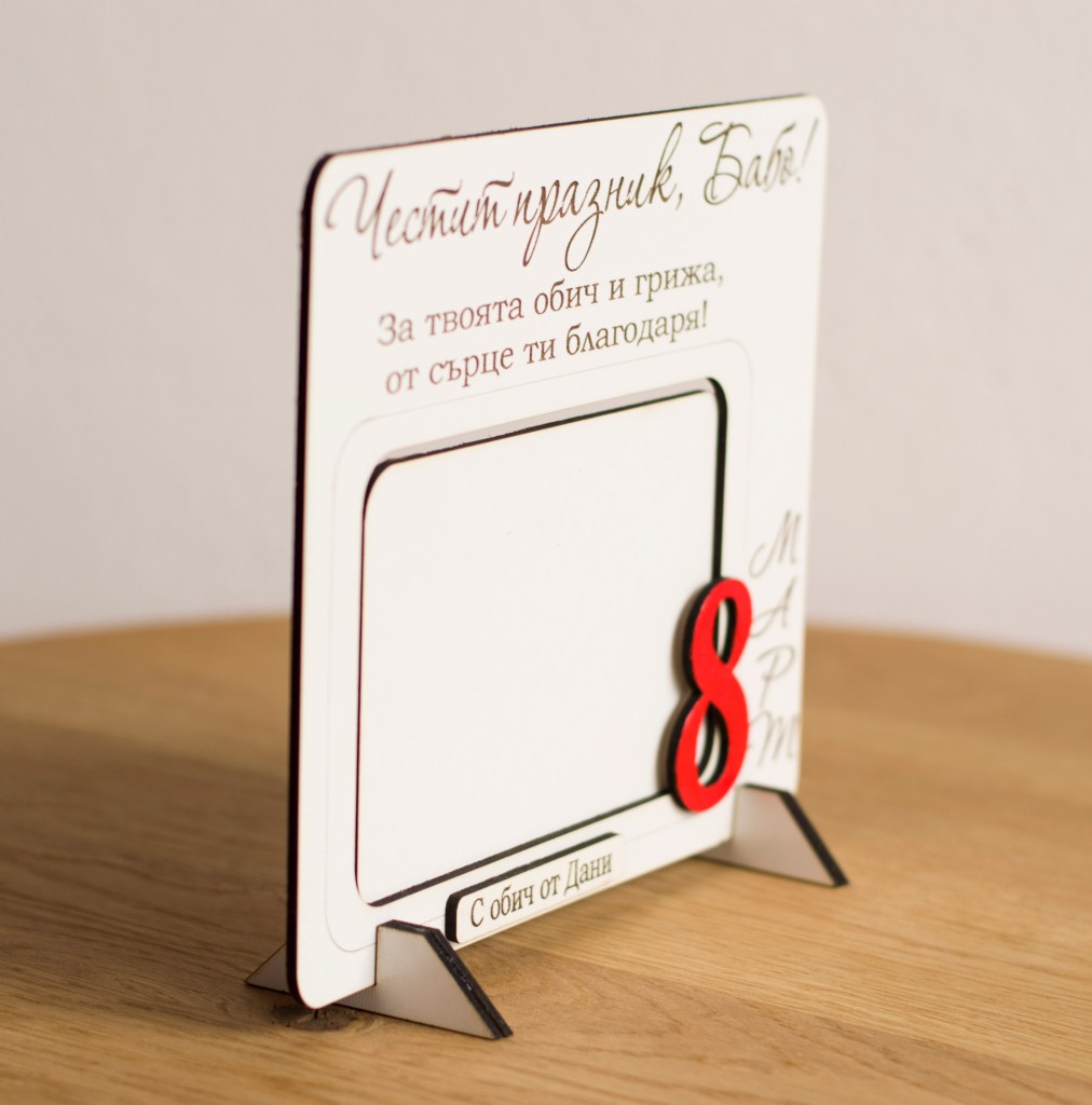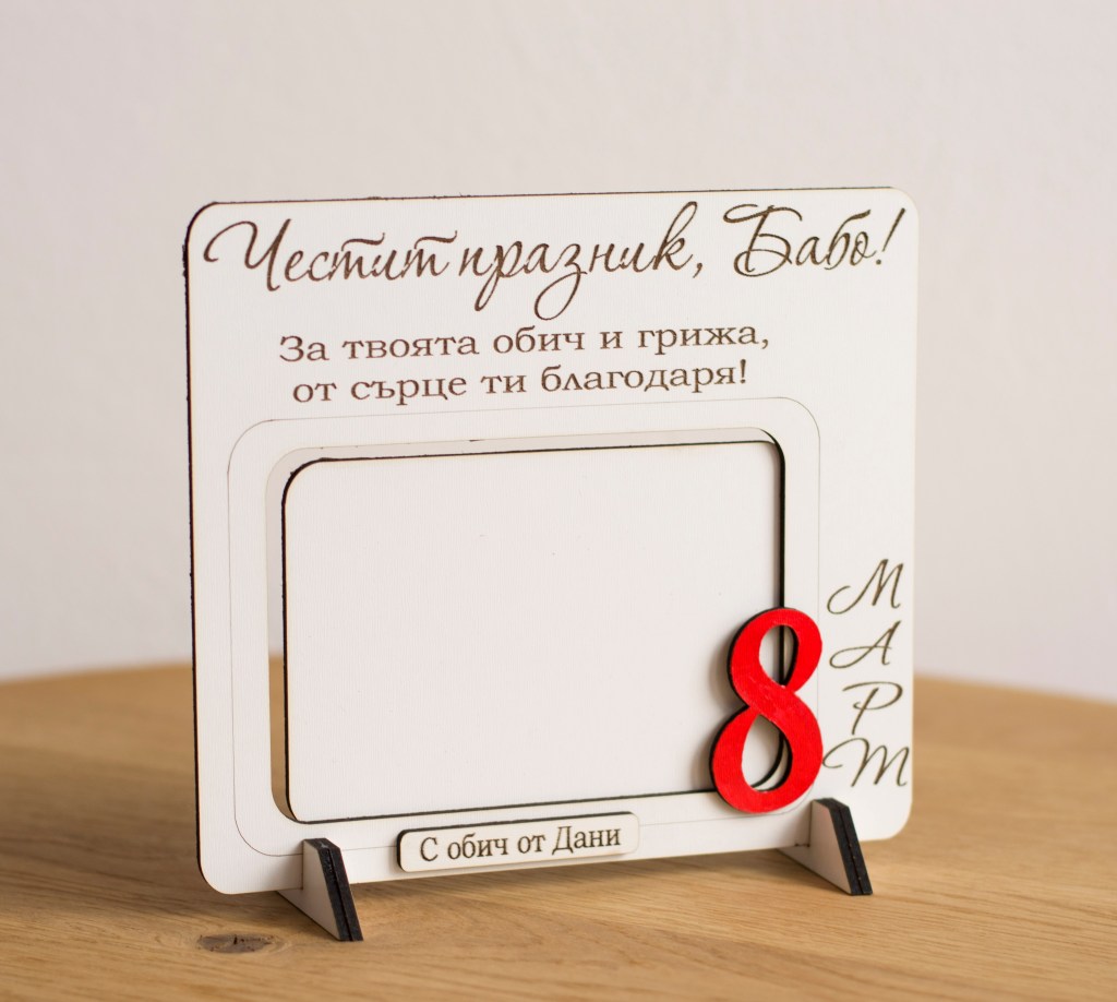 Чудесен подарък за 8 – ми Март, подходящ за мазйка, баба и др. Рамката може да бъде гравирана с имена и текст по избор. Снимката се поставя лесно, като се приплъзва между предната и задната част на рамката. Рамката е с крачета, които лесно се поставят. Изработена е от MDF.