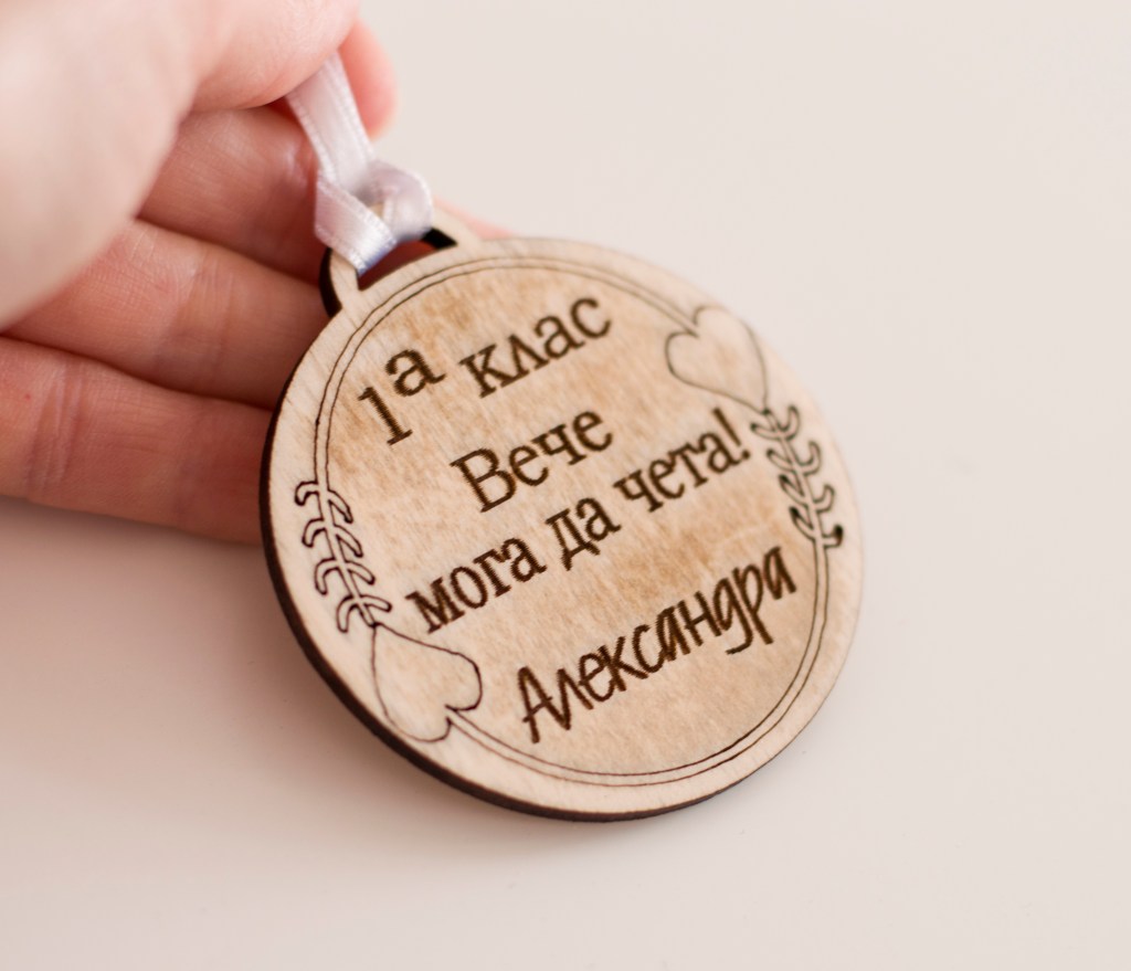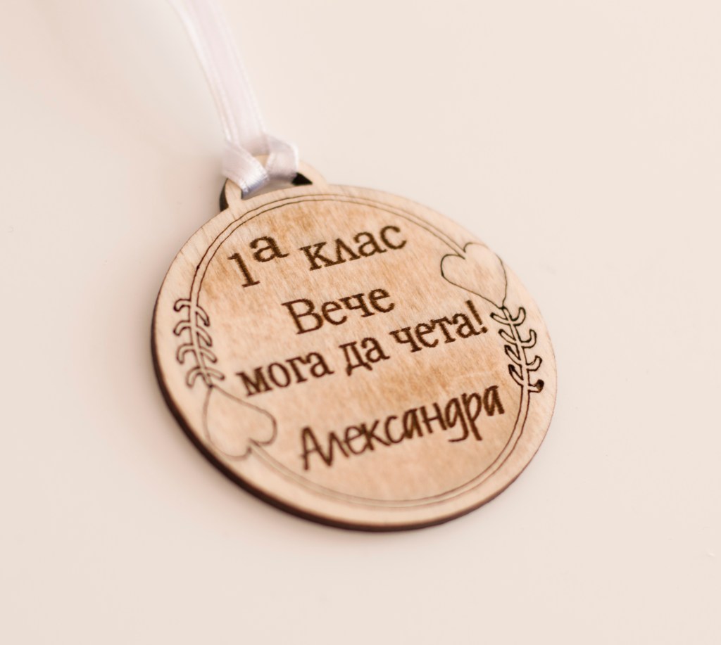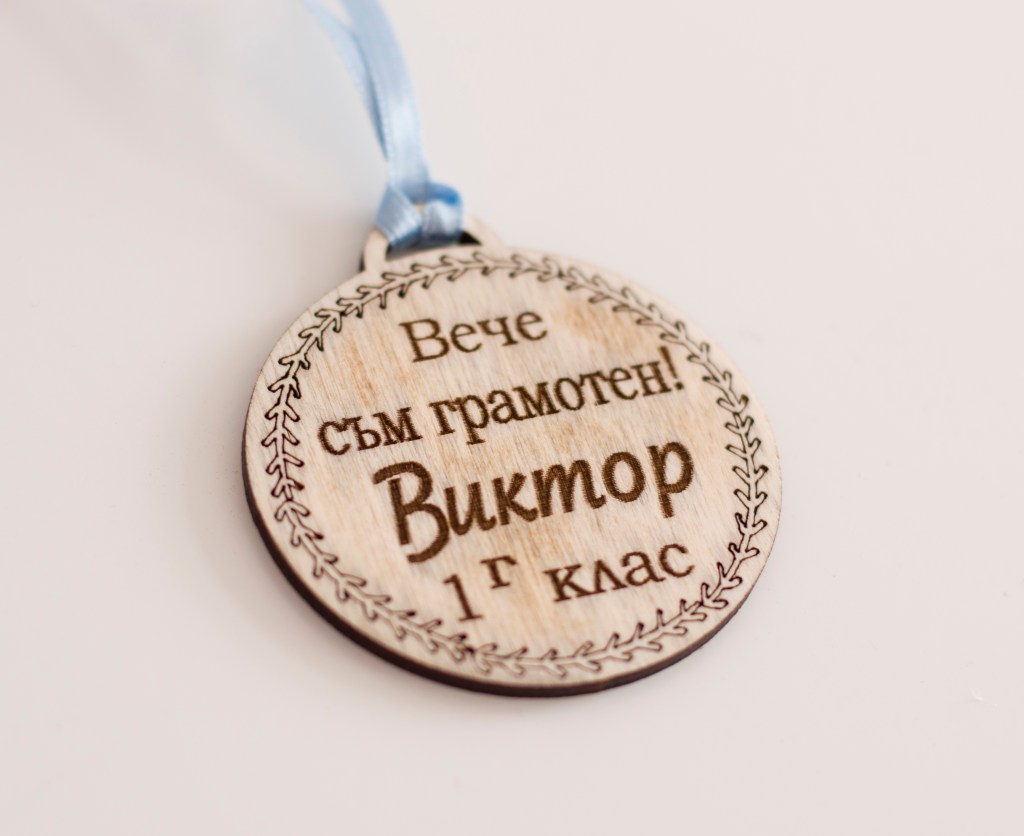 Персонализиран гравиран дървен медал, подходящ за малки и големи ученици. Mоже да бъде гравирано с текст по ваше желание, с шрифт по избор.