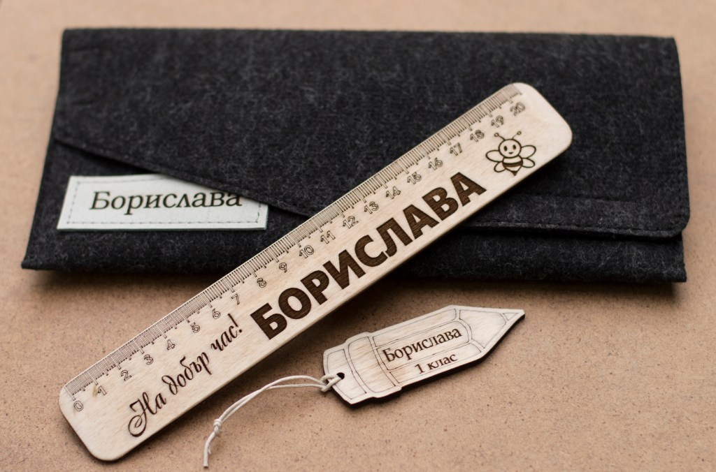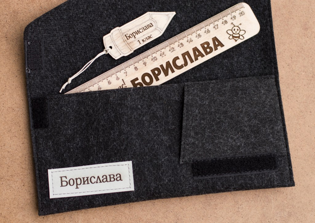 Персонализиран комплект, подходящ за подарък на малки и големи ученици. Несесерът има малко джобче и се затваря посредством велкро. Mоже да бъде гравиран с текст по ваше желание, с шрифт по избор.