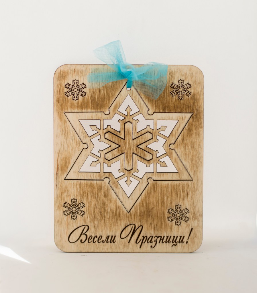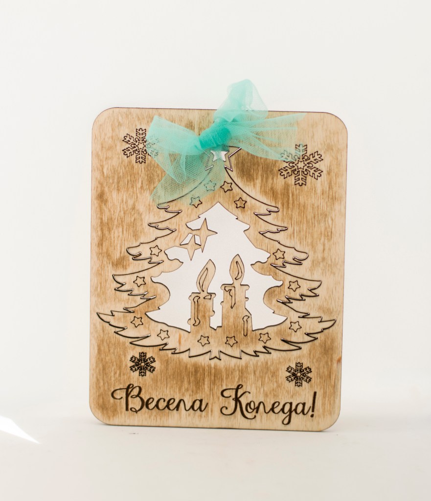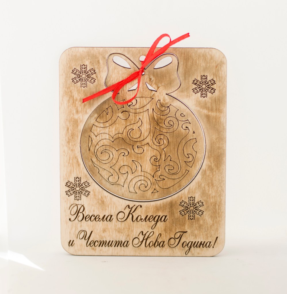Картичка превръщаща се в идеалната играчка за вашата елха. Интересно допълнение към тазгодишната украса. Подходяща е като подарък за приятели, семейство и колеги. Картичката може да бъде гравирана с текст по ваше желание, с шрифт по избор. Изработена е от шперплат и тюл/панделка. Цветът на тюла/памделката е по избор.