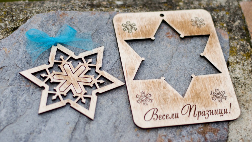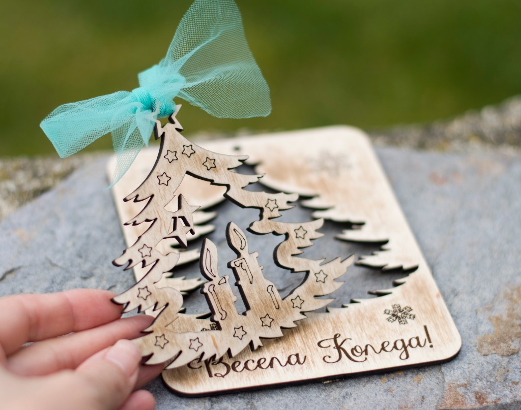 Персонализирана Коледна картичка с играчка, лазерно гравирани.