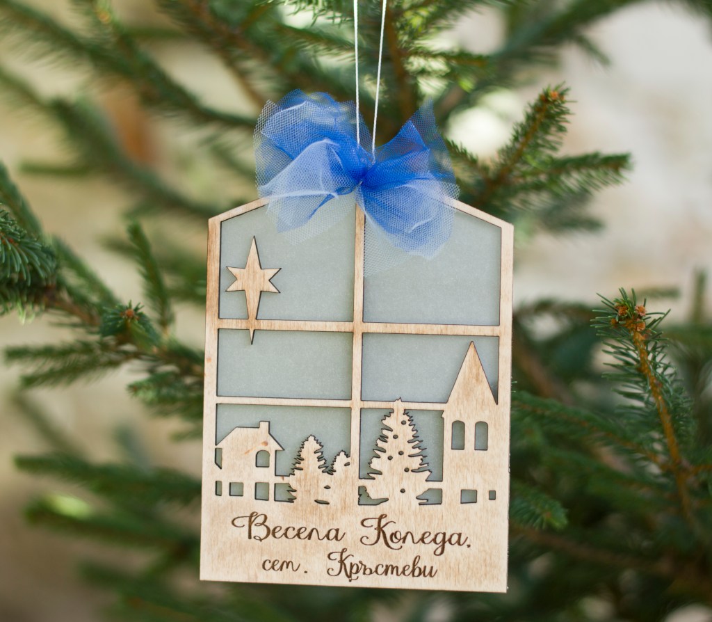 Едно много интересно допълнение към коледната ви украса. Подходящо за подарък на семейство, приятели и колеги. Може да бъде персонализирано с текст по ваше желание, с шрифт по избор. Изработено е от шперплат, тюл и оризова хартия.