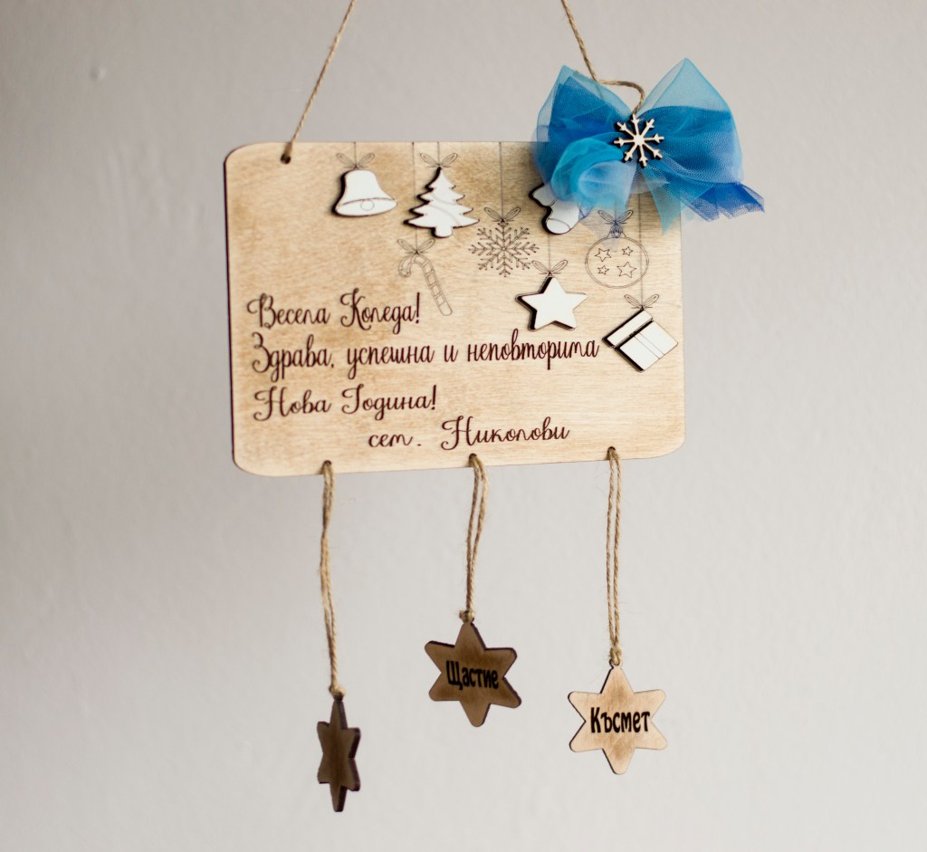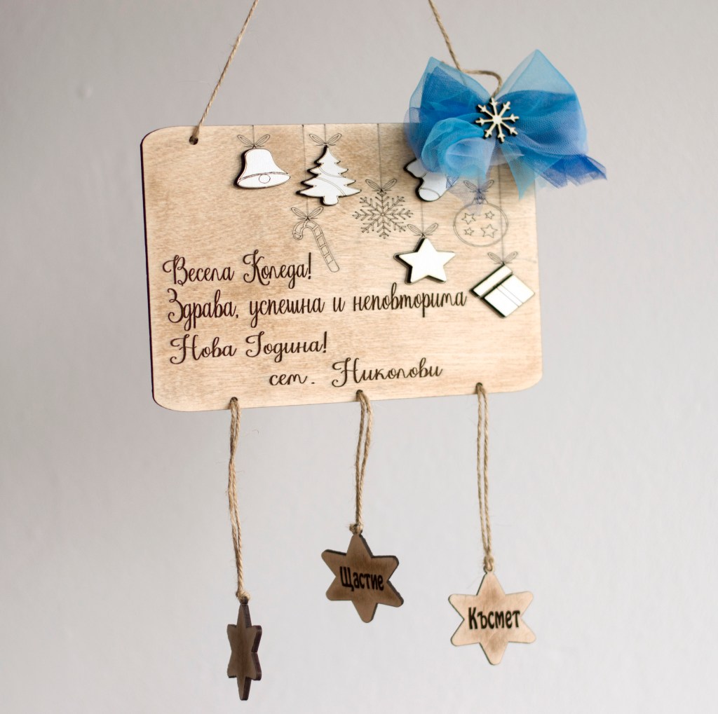 Красиво допълнение към коледната ви украса. Подходяща за подарък на семейство, приятели и близки. Табелката може да бъде персонализирана с текст, име и шрифт по избор. Изработена е от шперплат, бял мдф и тюл.
