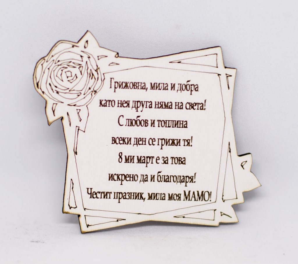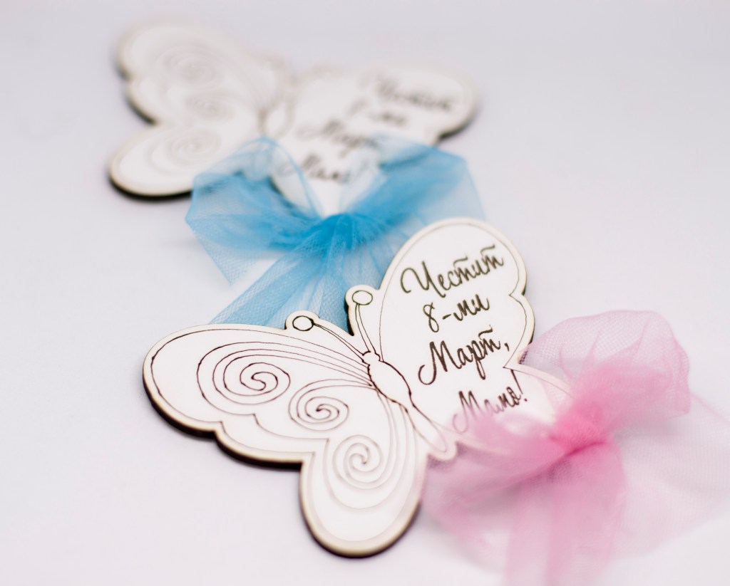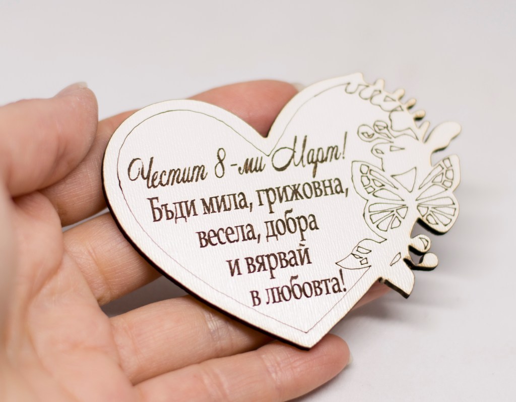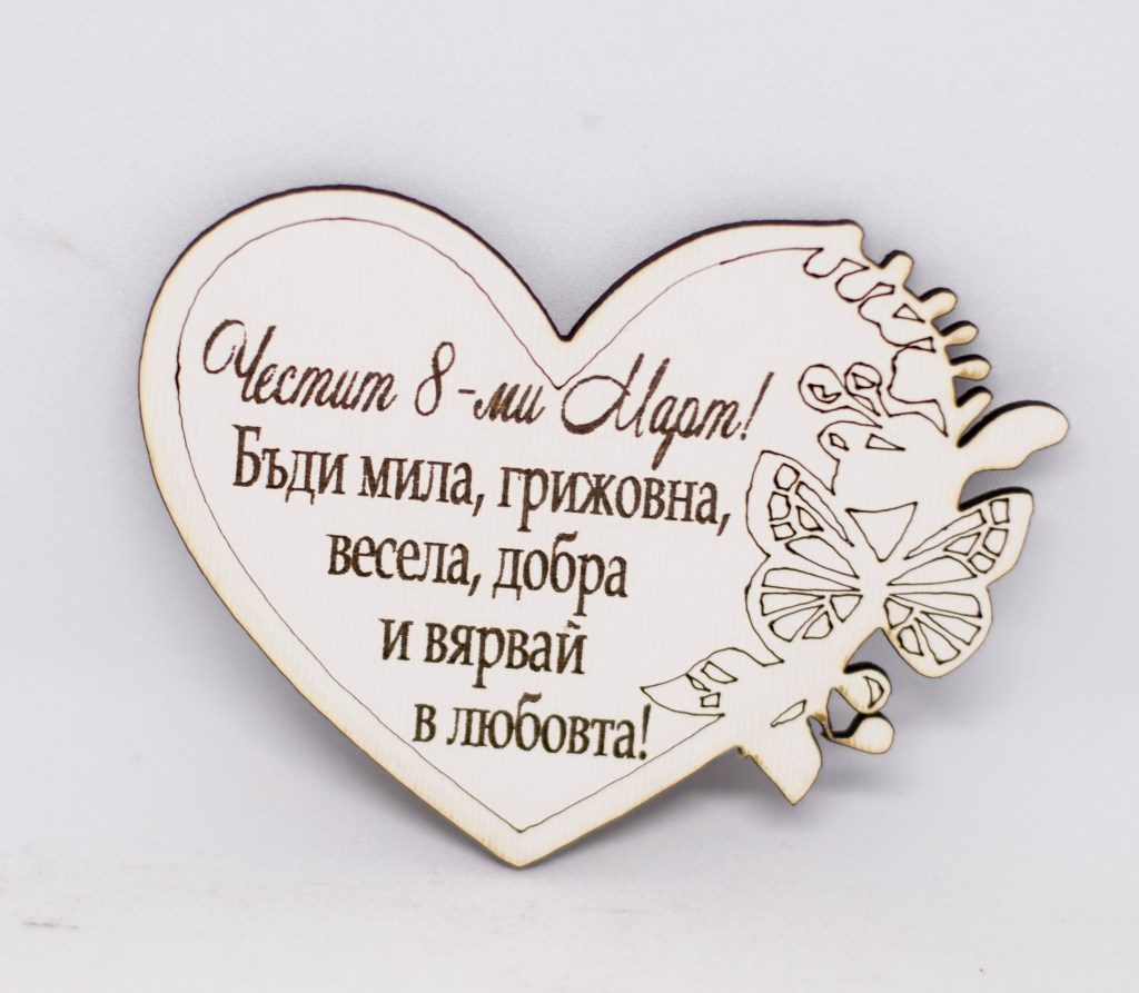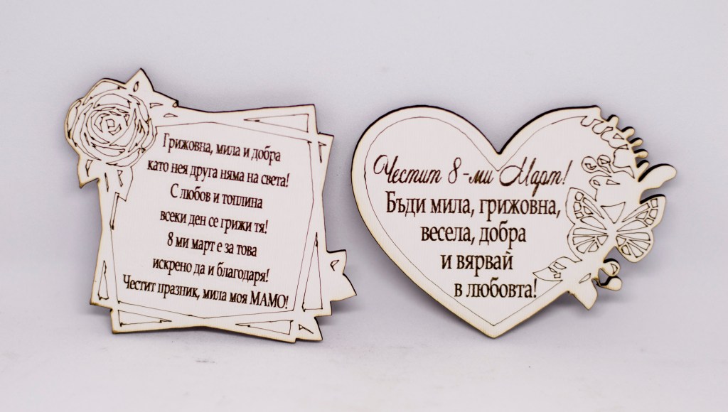 Дървени магнитчета за 8 – ми Март от бял МДФ, лазерно гравирани.