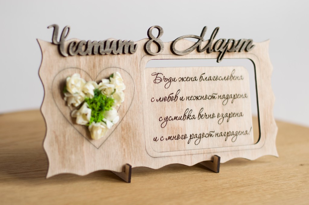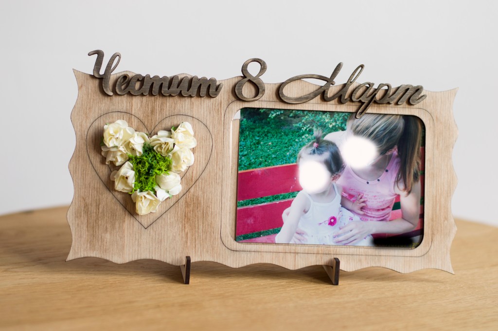 Чудесен подарък за 8 – ми Март, подходящ за майка, баба и др. Паното може да бъде изработено само като пано или като рамка (с място за снимка). Може да бъде гравирано с имена и текст по избор. Снимката се поставя лесно, като се приплъзва между предната и задната част на рамката. Паното е на стойка.