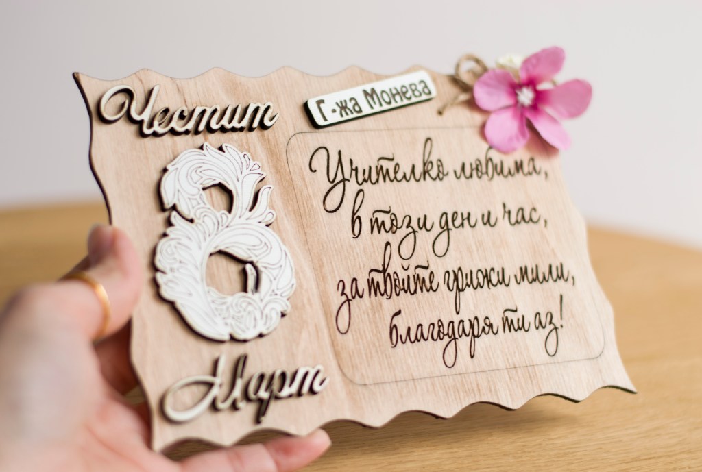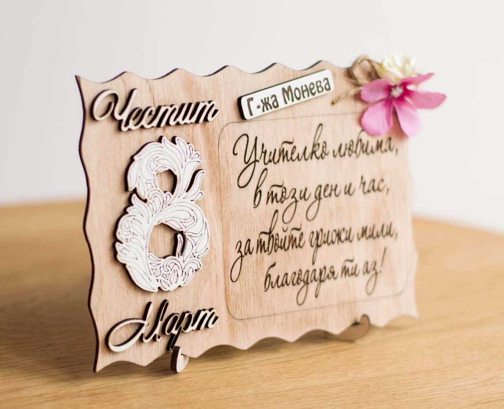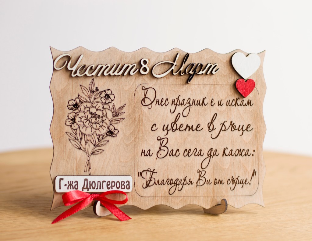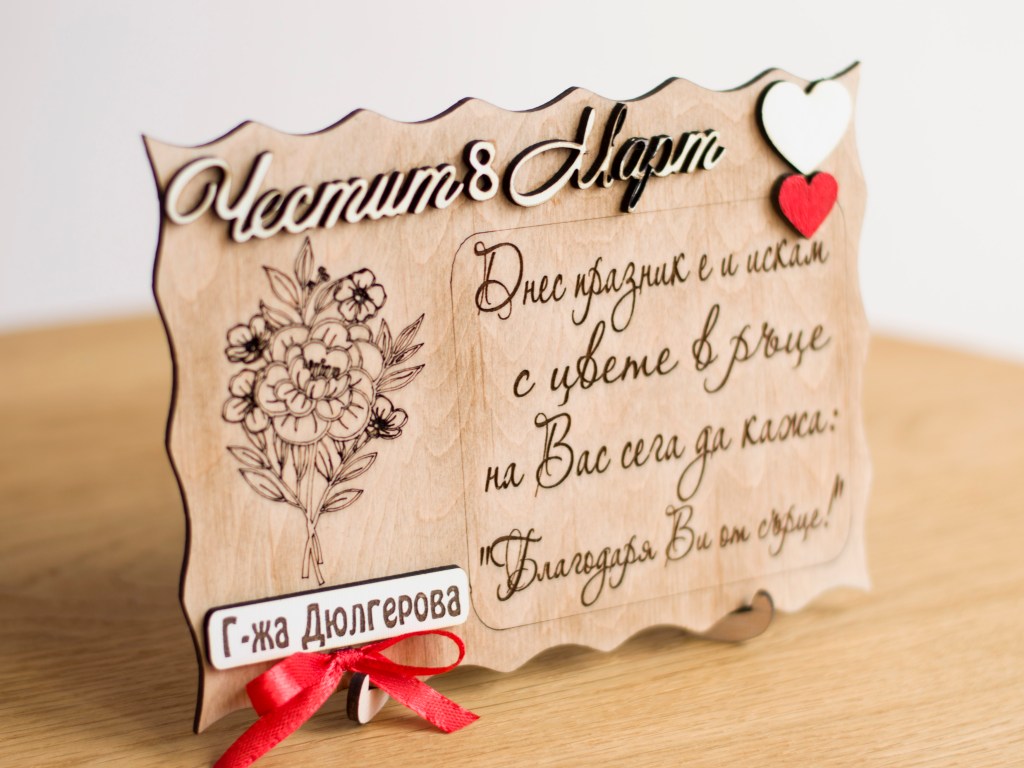 Чудесен подарък за 8 – ми Март. Може да бъде гравирано с имена и текст по избор. Паното е на стойка.
