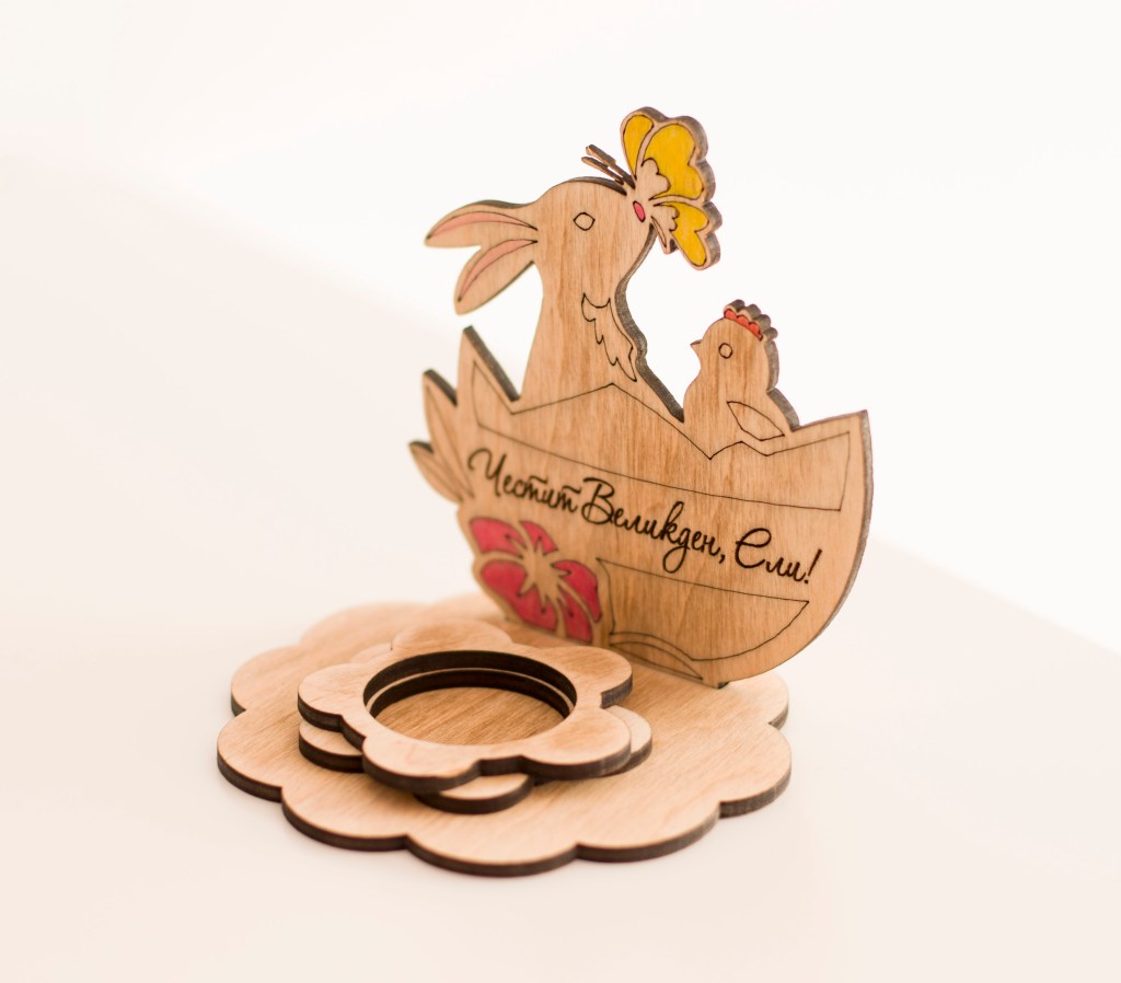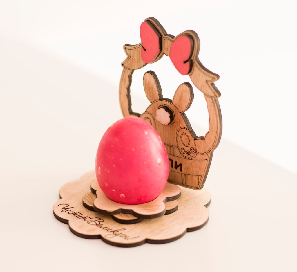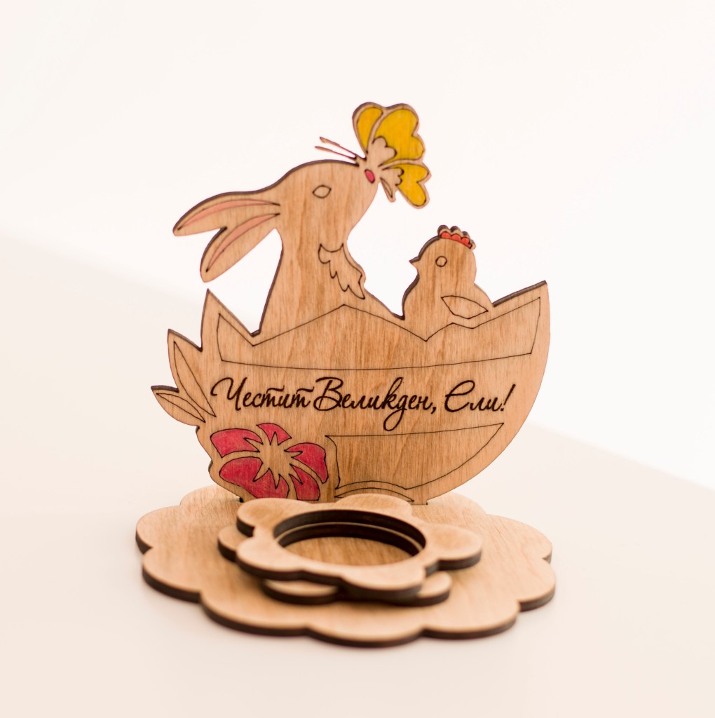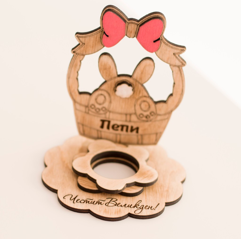 Персонализирана поставка за яйце за Великден. Mоже да бъде гравирана с име и/или текст по ваше желание, с шрифт по избор. Предлага се в два варианта – зайче и кошничка.