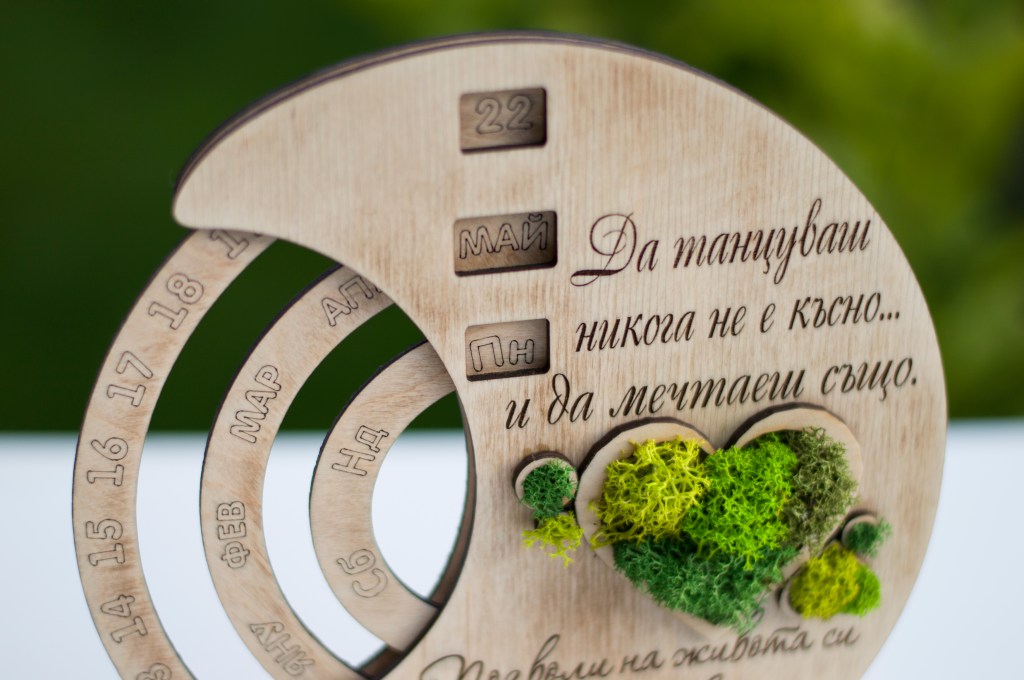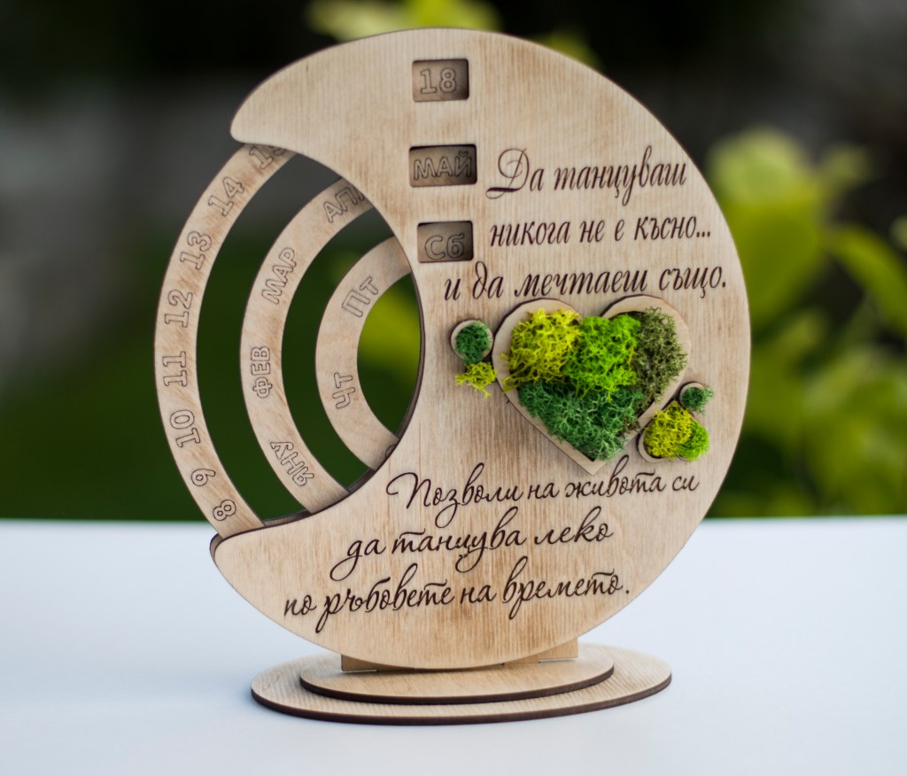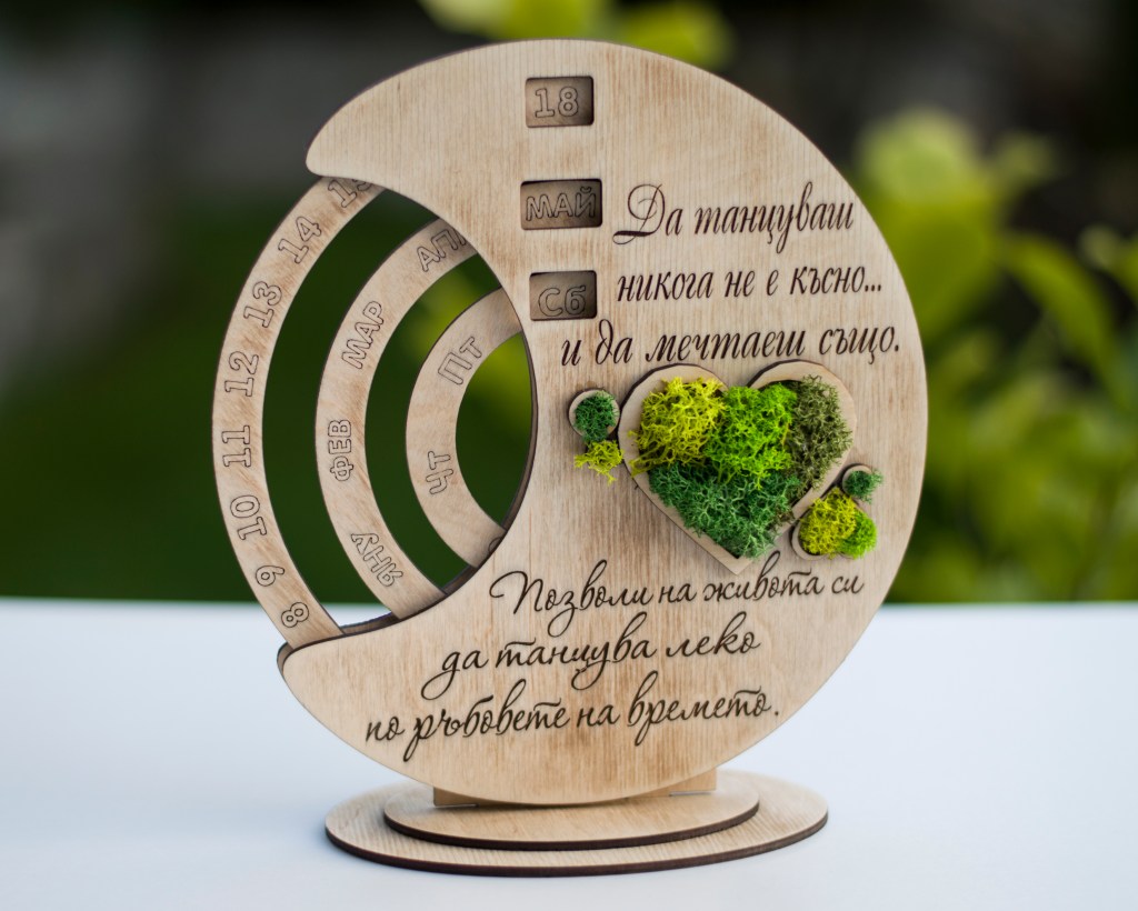 Персонализиран вечен календар със скандинавски мъх, лазерно гравиран.