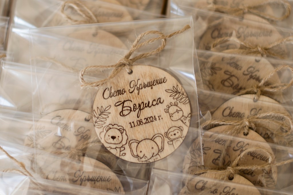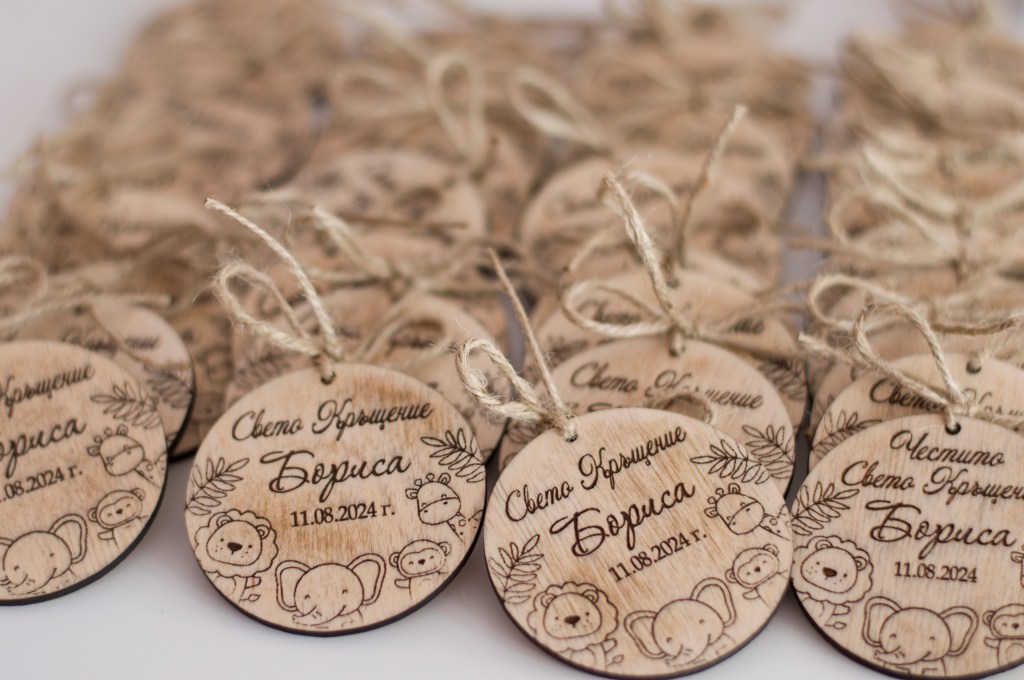 Персонализирано подаръче за гостите на вашето тържество. Mоже да бъде гравирано с текст по ваше желание, с шрифт по избор. Подходящо за кръщене, погача, юбилей и др. Може да бъде изработено и като магнитче.