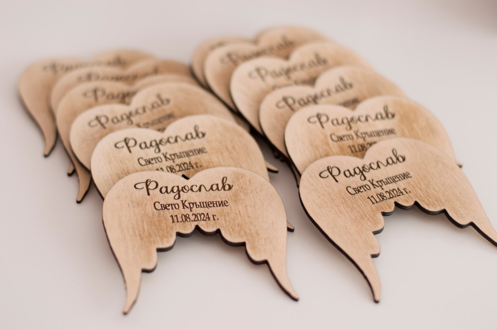 Персонализирано подаръче за гостите на вашето тържество. Mоже да бъде гравирано с текст по ваше желание, с шрифт по избор. Подходящо за кръщене, погача и др. Може да бъде изработено и като магнитче.