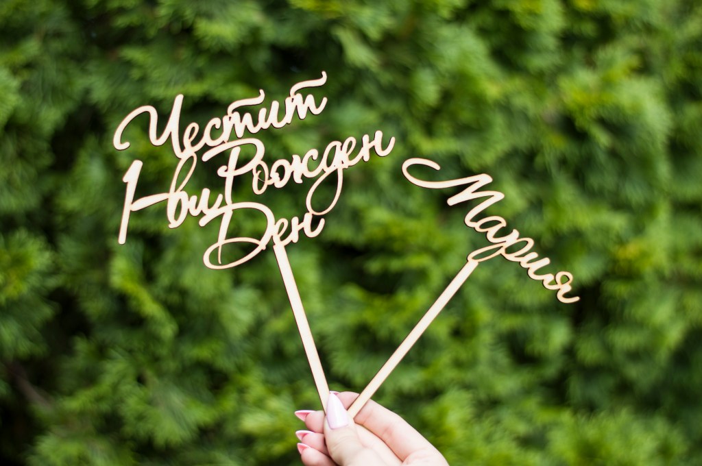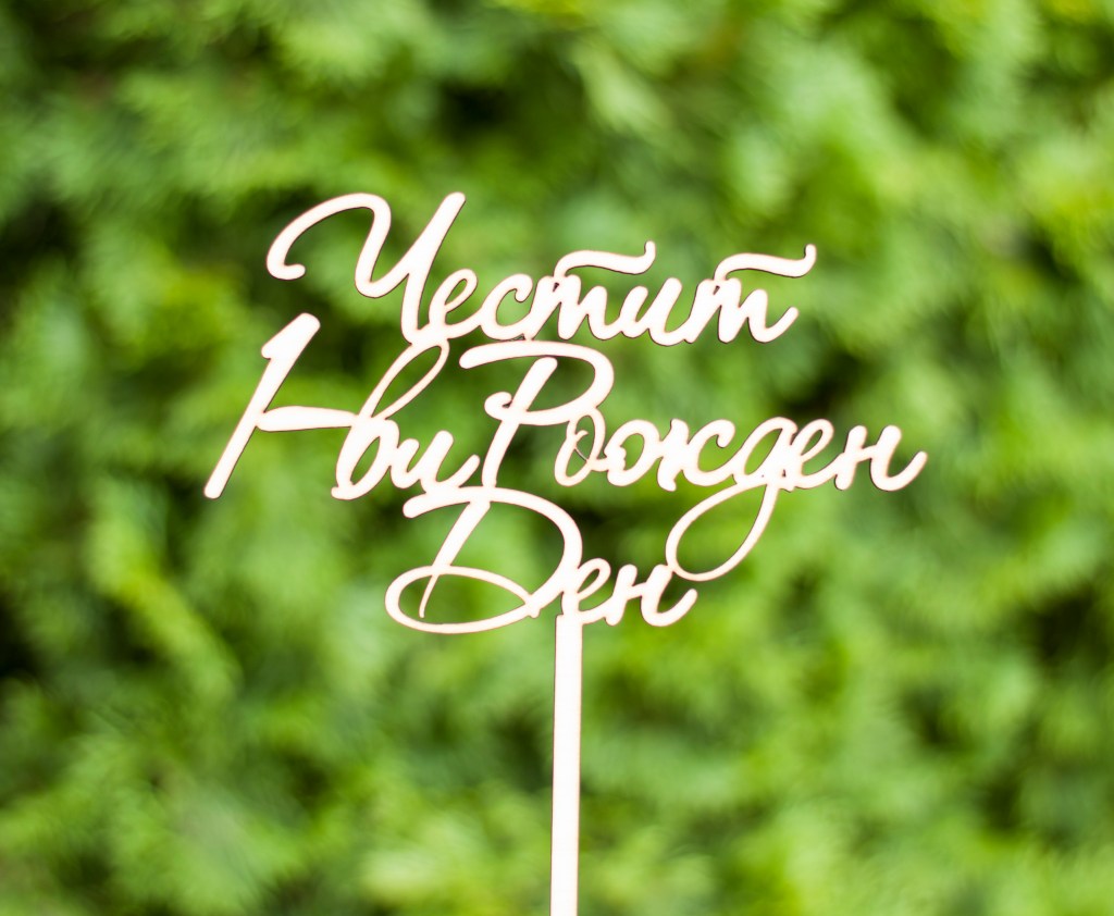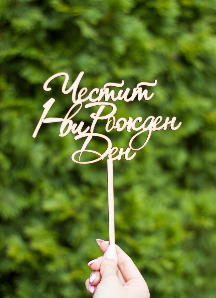 Персонализиран дървен топер за торта. Mоже да бъде изработен за всеки повод, с текст по избор. Подходящ за рожден ден, имен ден, юбилей, кръщене, погача и др.