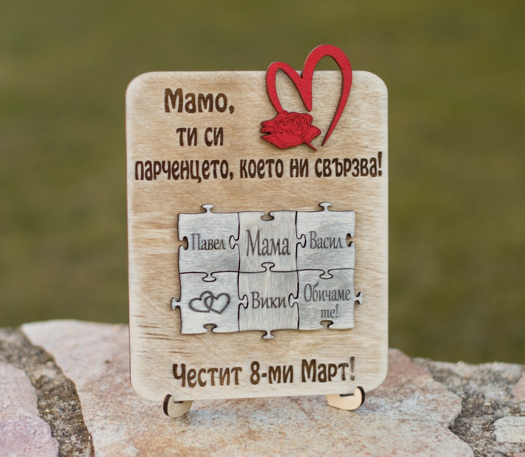 Чудесен подарък, подходящ за 8 Март, а защо не и за рожден ден и други поводи. Картичката може да бъде гравирана с текст и имена по избор. Картичката е на поставка.
