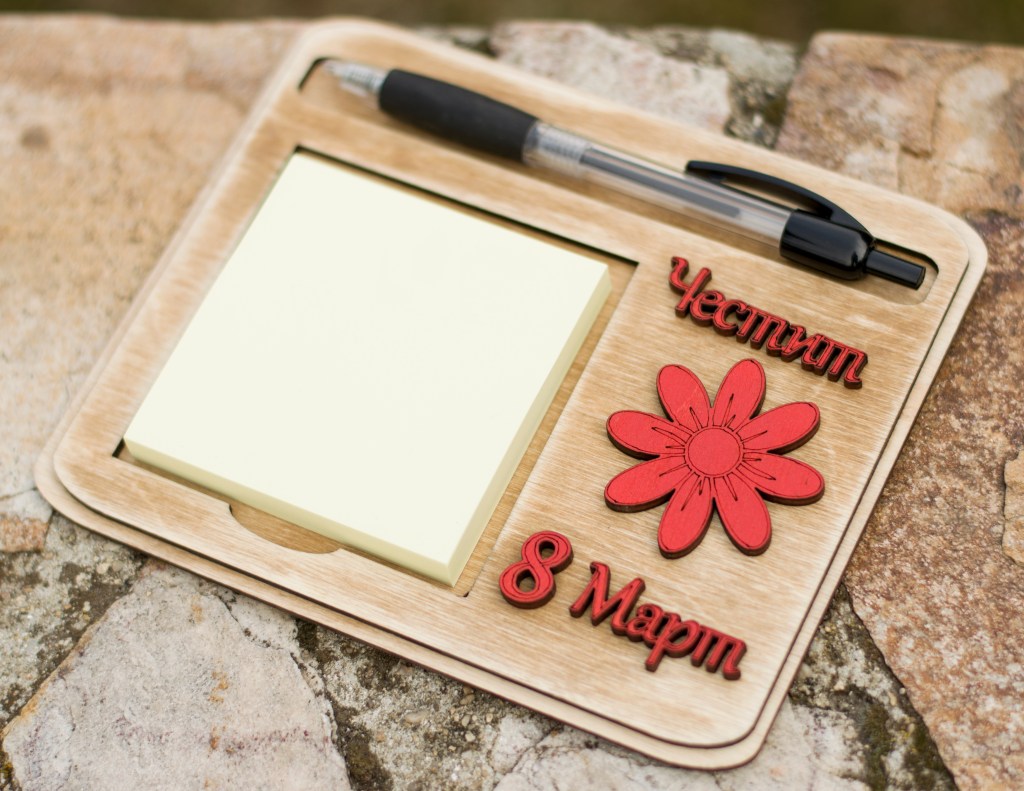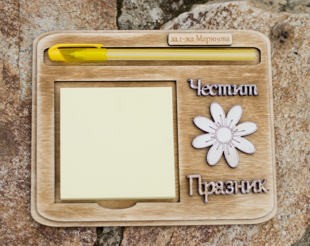Симпатичен персонализиран подарък подходящ за любимата учителка, приятелка, колега. Поставката може да бъде гравирана с текст по ваше желание, с цвете в цвят по избор. Поставката се предлага в два варианта – празна или с кубче листчета и химикал.