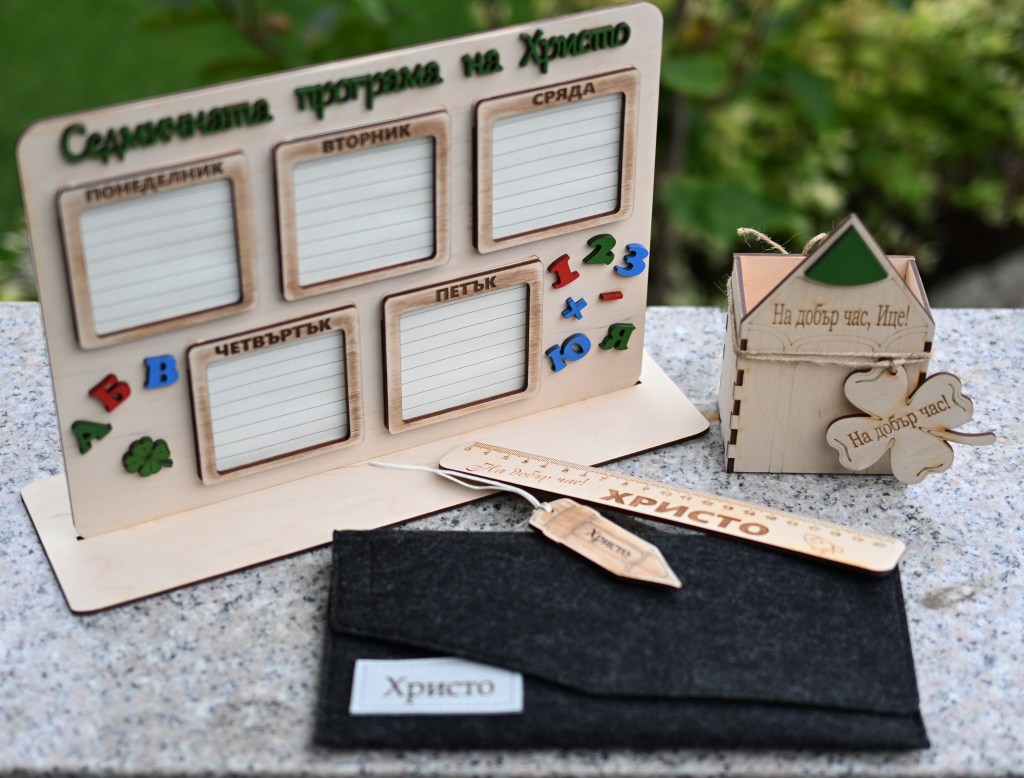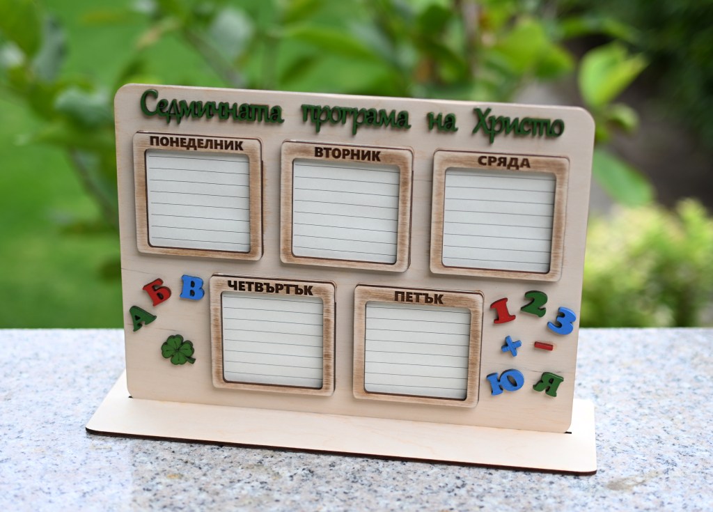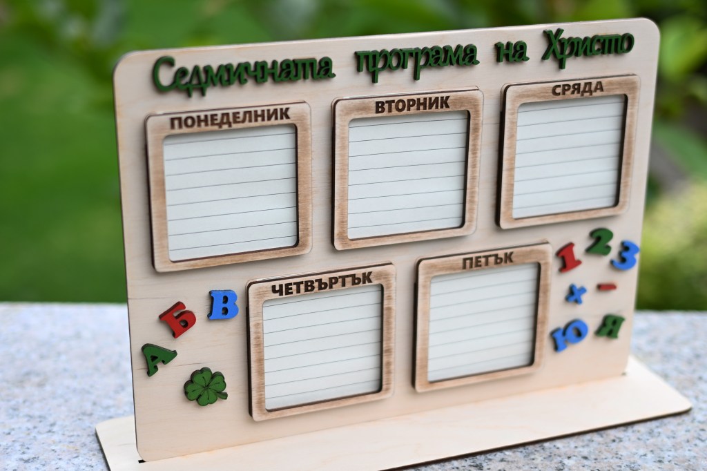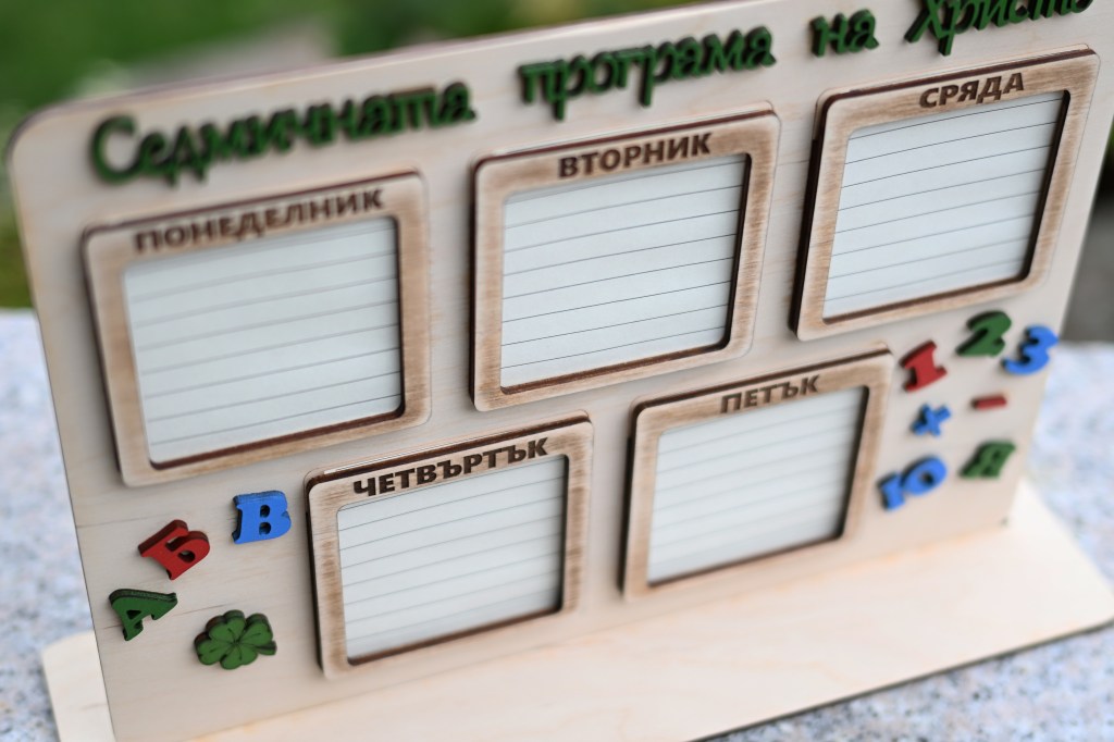 Персонализирана ученическа седмична програма. Програмата може да се декорира с елементи по избор. Може да бъде гравирана с текст по ваше желание.