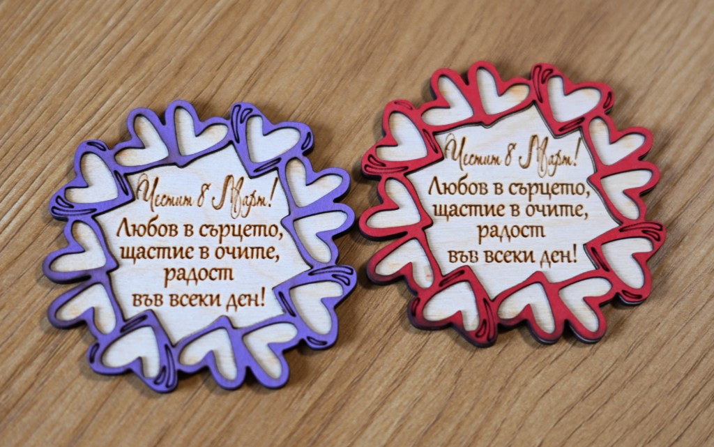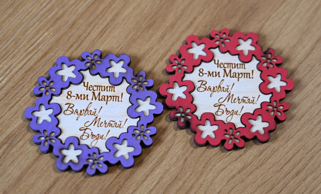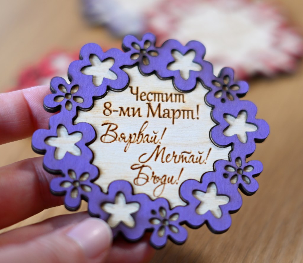 Персонализирани магнитчета за 8-ми Март, лазерно гравирани.